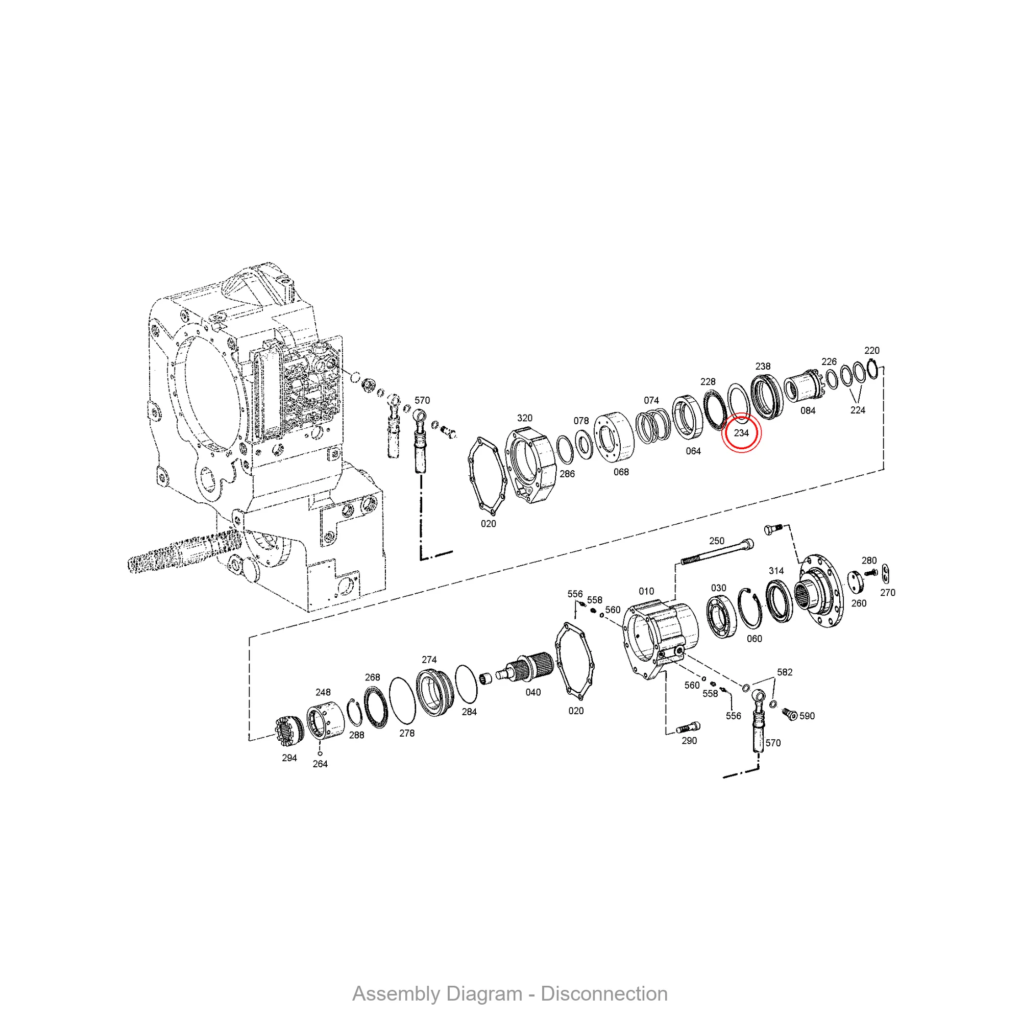 This axial washer is located in the disconnection area of the transmission. It appears in 2 different assembly configurations. In the service manual, look for position number 234 in the Disconnection section.