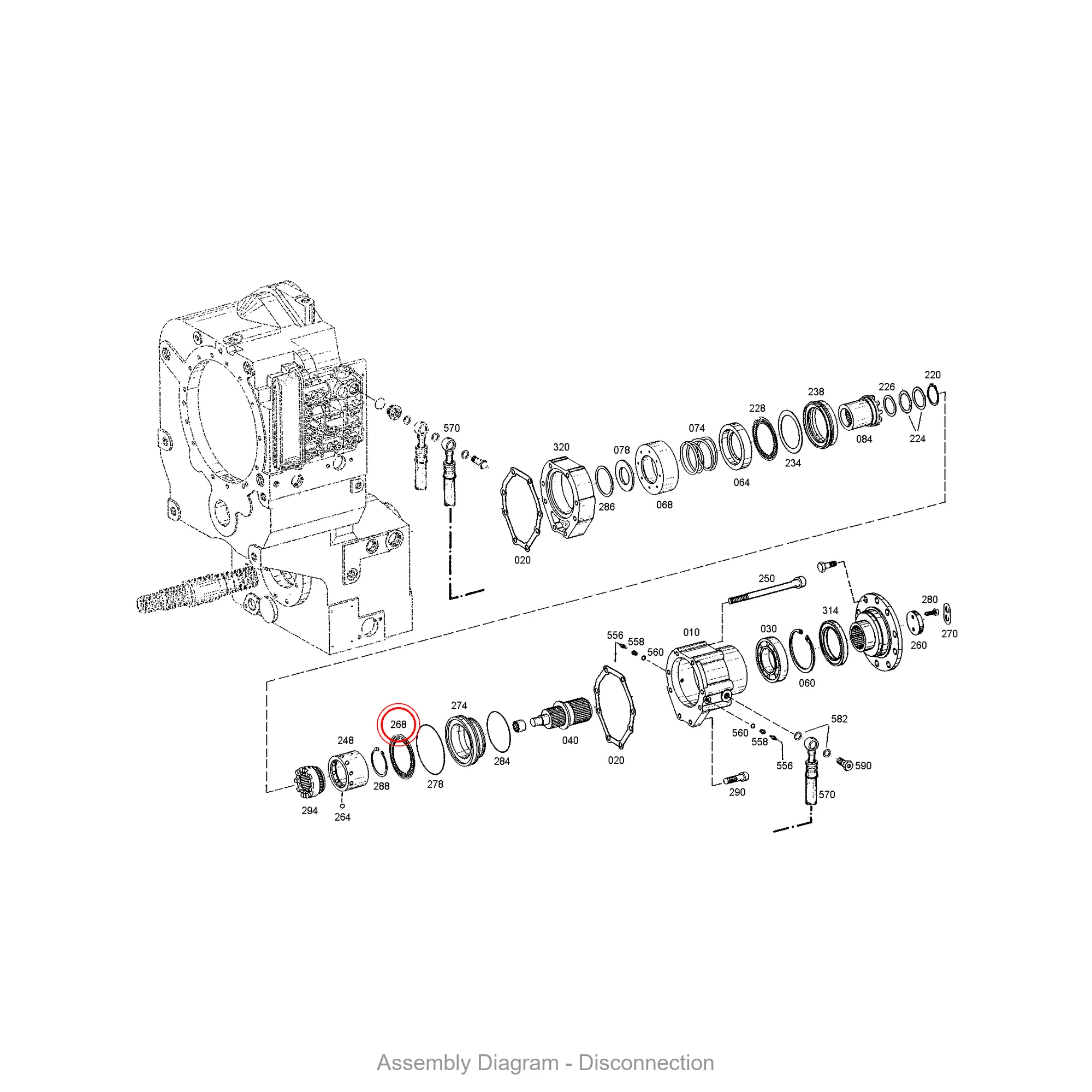 This axial needle cage is located in the disconnection, output area of the transmission. It appears in 4 different assembly configurations. In the service manual, look for position number 268 in the Disconnection section.