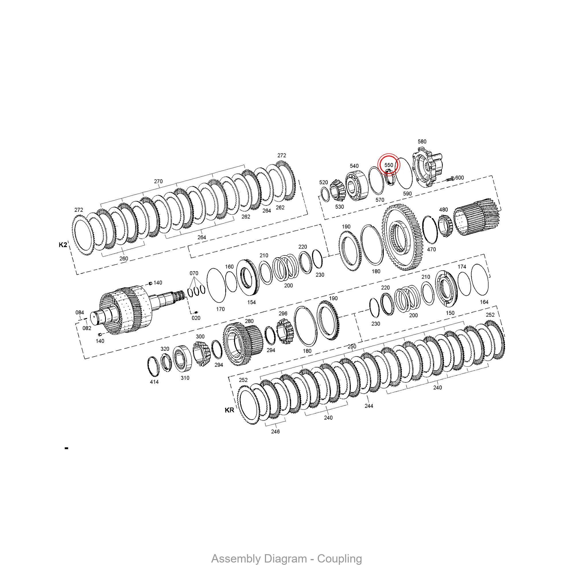 This slotted nut is located in the coupling area of the transmission. It appears in 30 different assembly configurations. In the service manual, look for position number 550 in the Coupling section.
