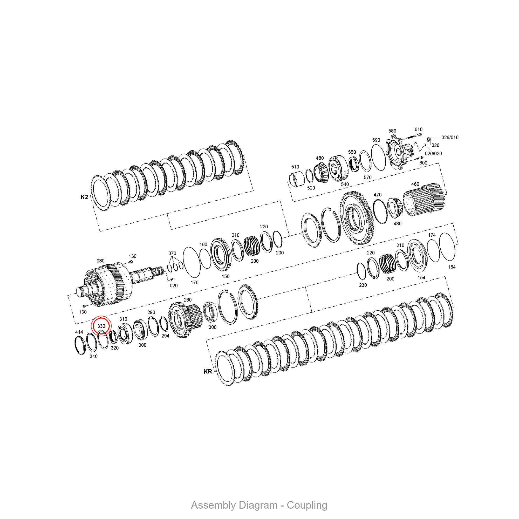 This ring is located in the coupling area of the transmission. It appears in 13 different assembly configurations. In the service manual, look for position number 330 in the Coupling section.
