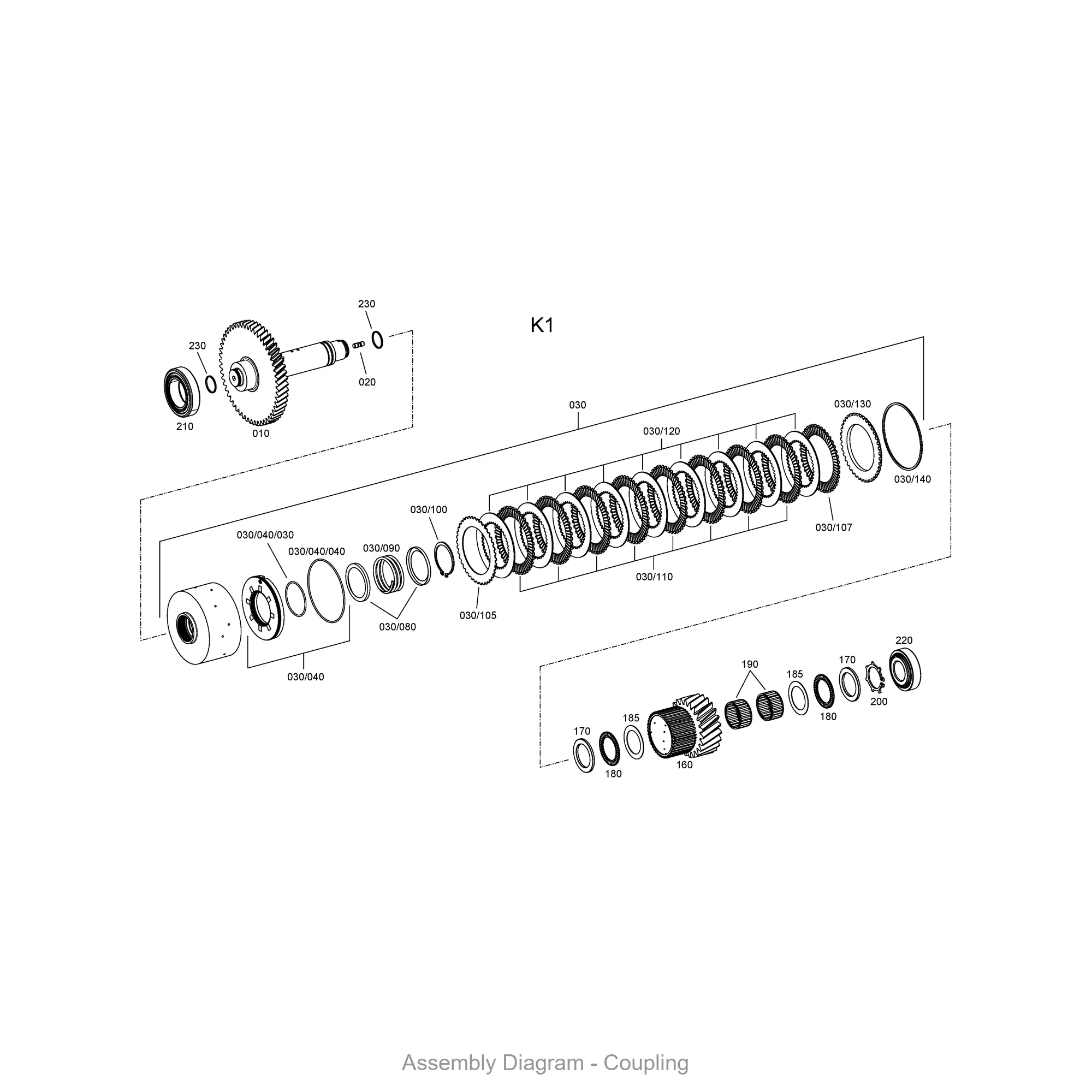 This snap ring is located in the coupling area of the transmission. It appears in 11 different assembly configurations. In the service manual, look for position number 030/140/120 in the Coupling section.