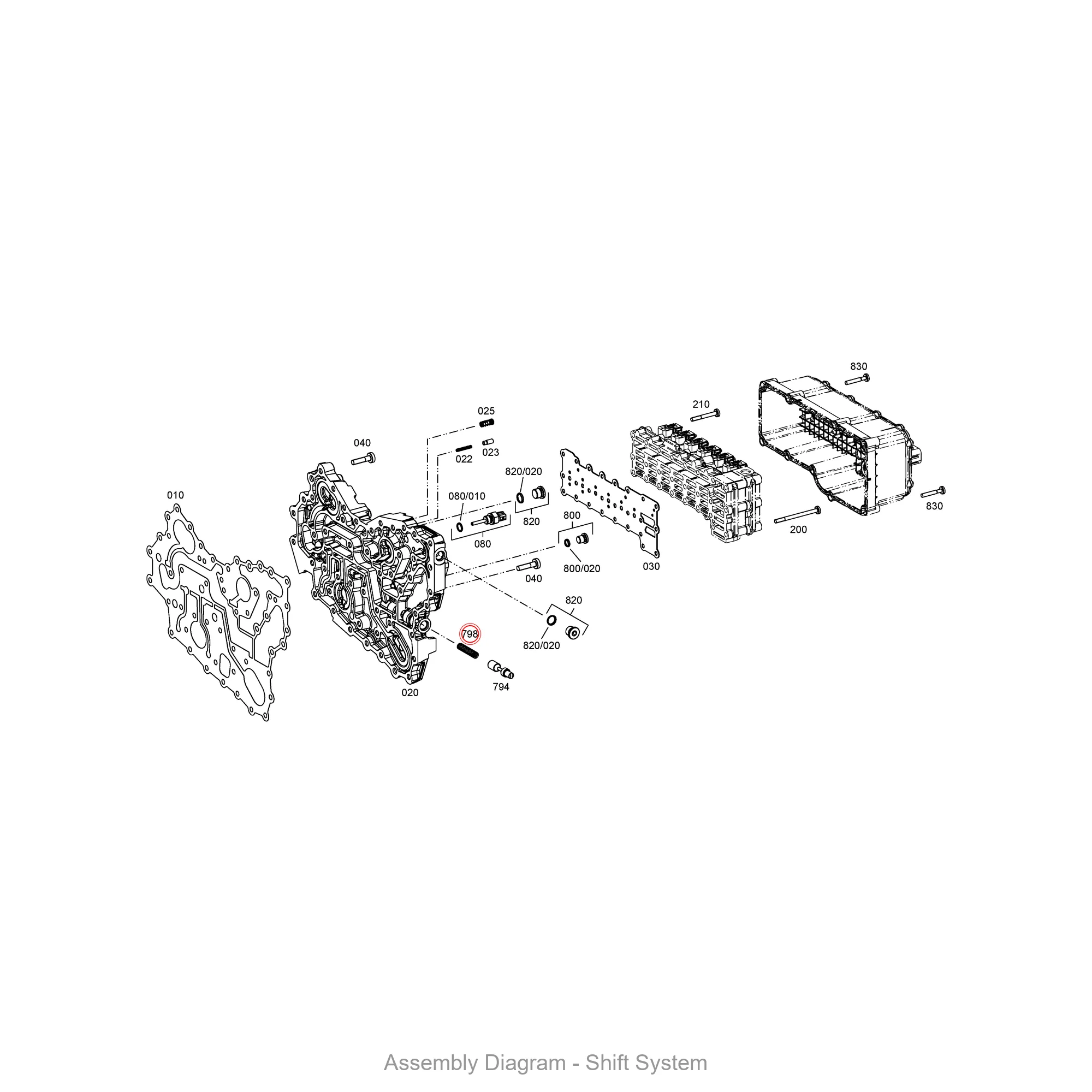 This compression spring is located in the shift system area of the transmission. It appears in 30 different assembly configurations. In the service manual, look for position number 798 in the Shift System section.