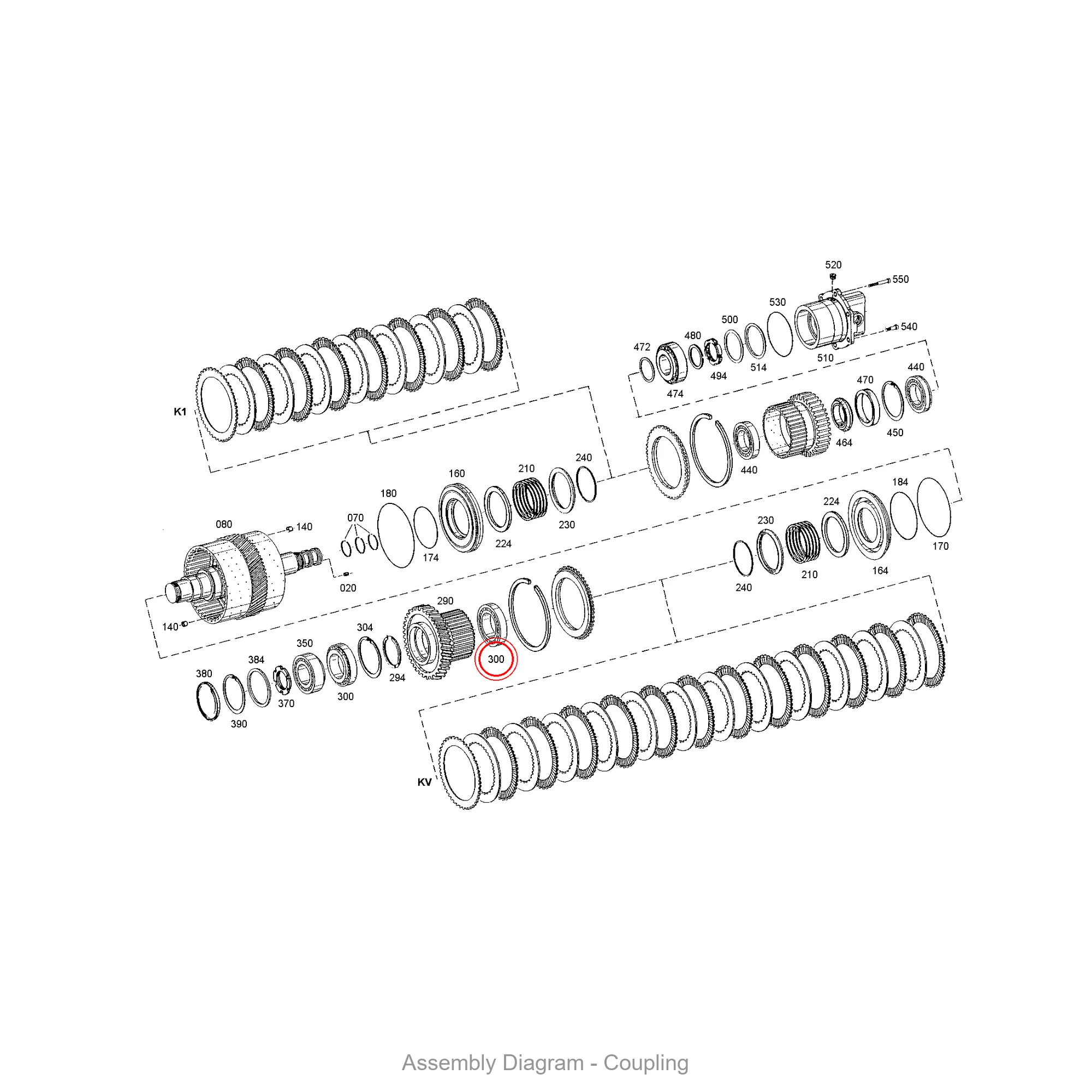 This tapered roller bearing is located in the coupling area of the transmission. It appears in 14 different assembly configurations. In the service manual, look for position number 300 in the Coupling section.
