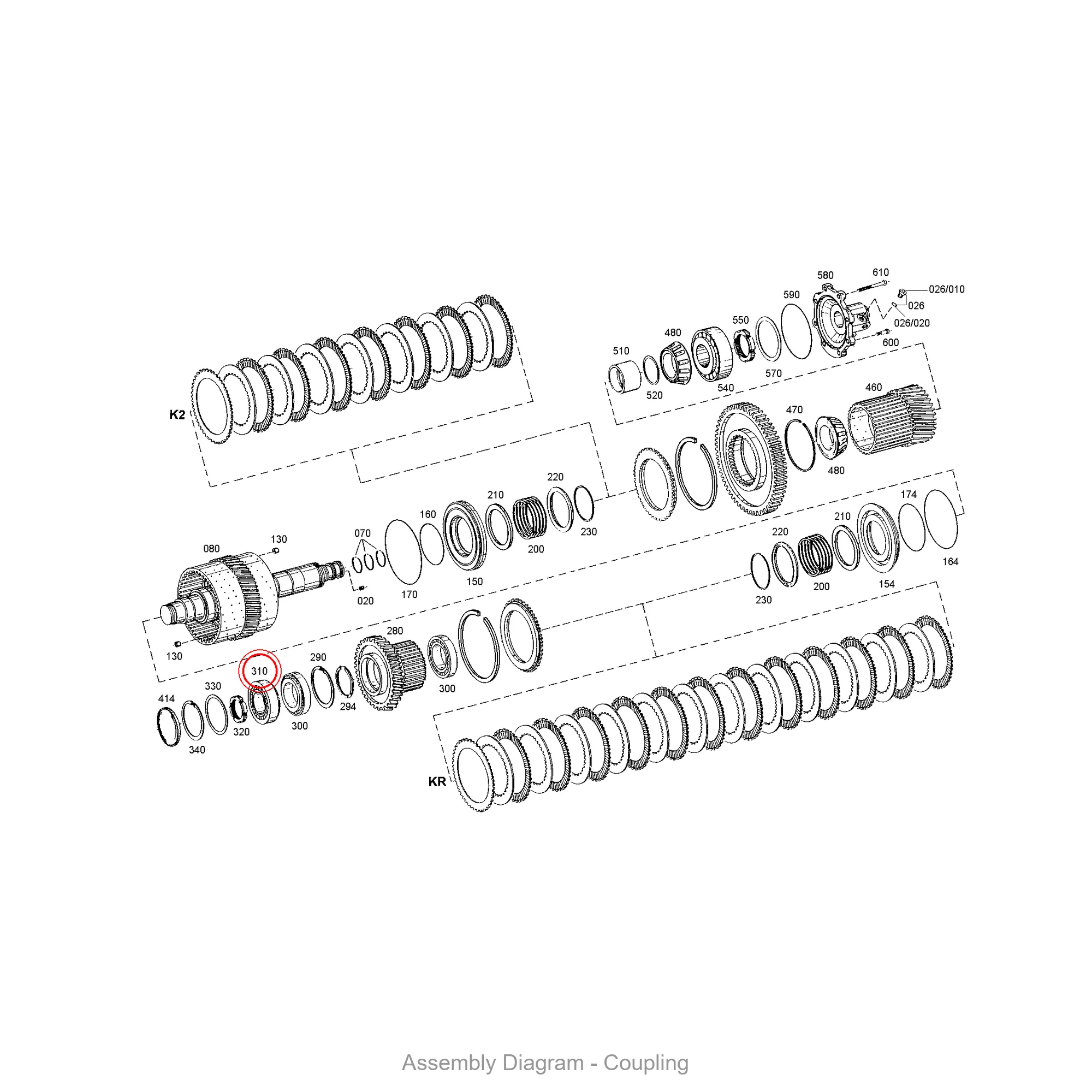 This tapered roller bearing is located in the coupling area of the transmission. It appears in 13 different assembly configurations. In the service manual, look for position number 310 in the Coupling section.