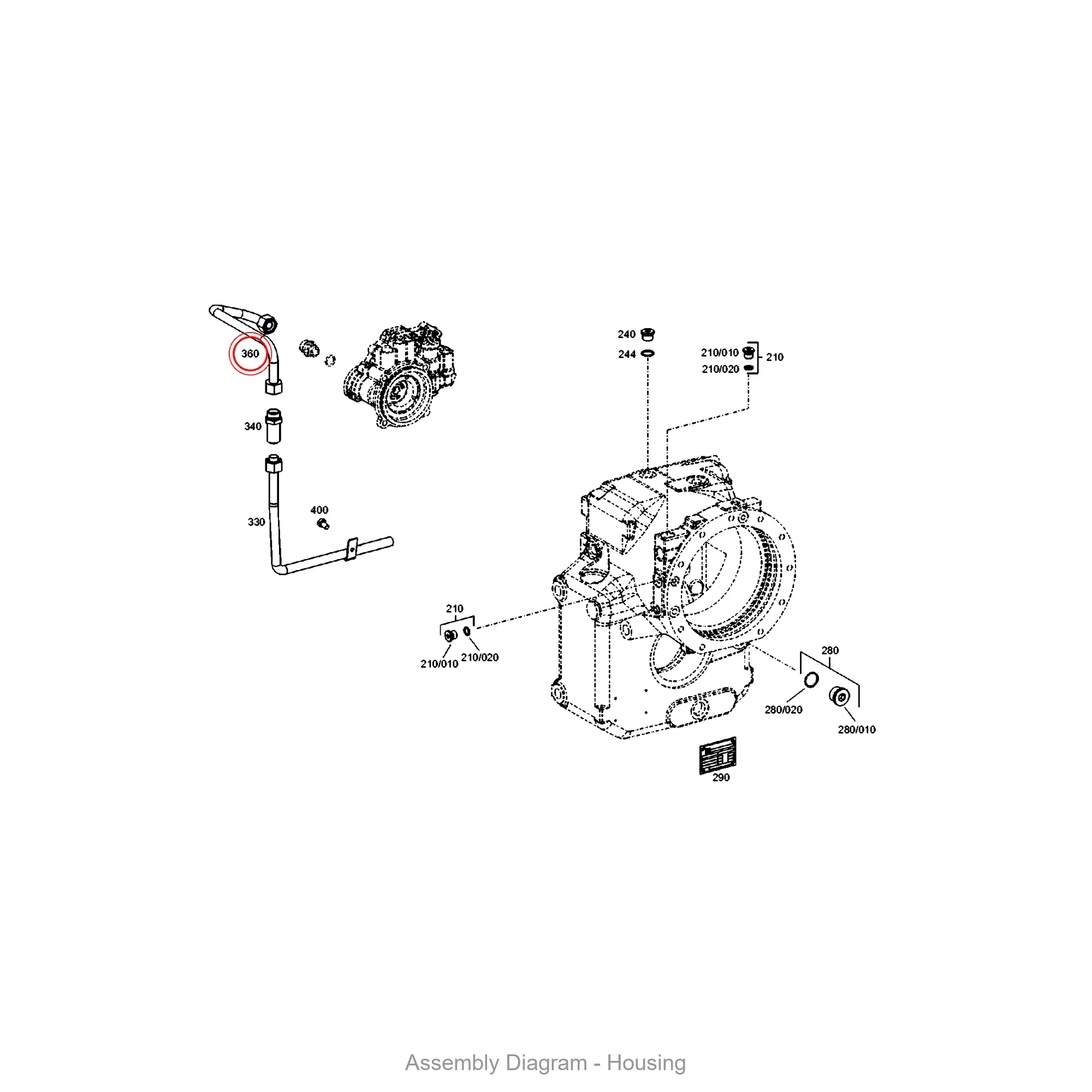 This tube is located in the housing area of the transmission. It appears in 30 different assembly configurations. In the service manual, look for position number 360 in the Housing section.