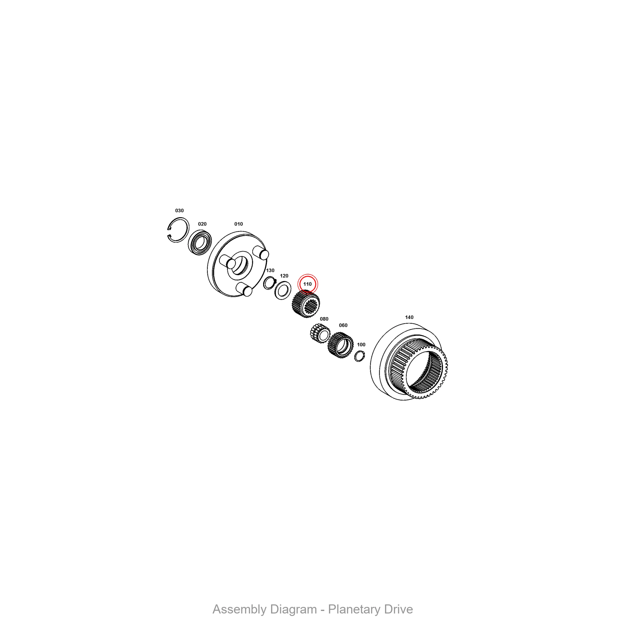 This sun gear is located in the planetary drive area of the transmission. It appears in 30 different assembly configurations. In the service manual, look for position number 110 in the Planetary Drive section.