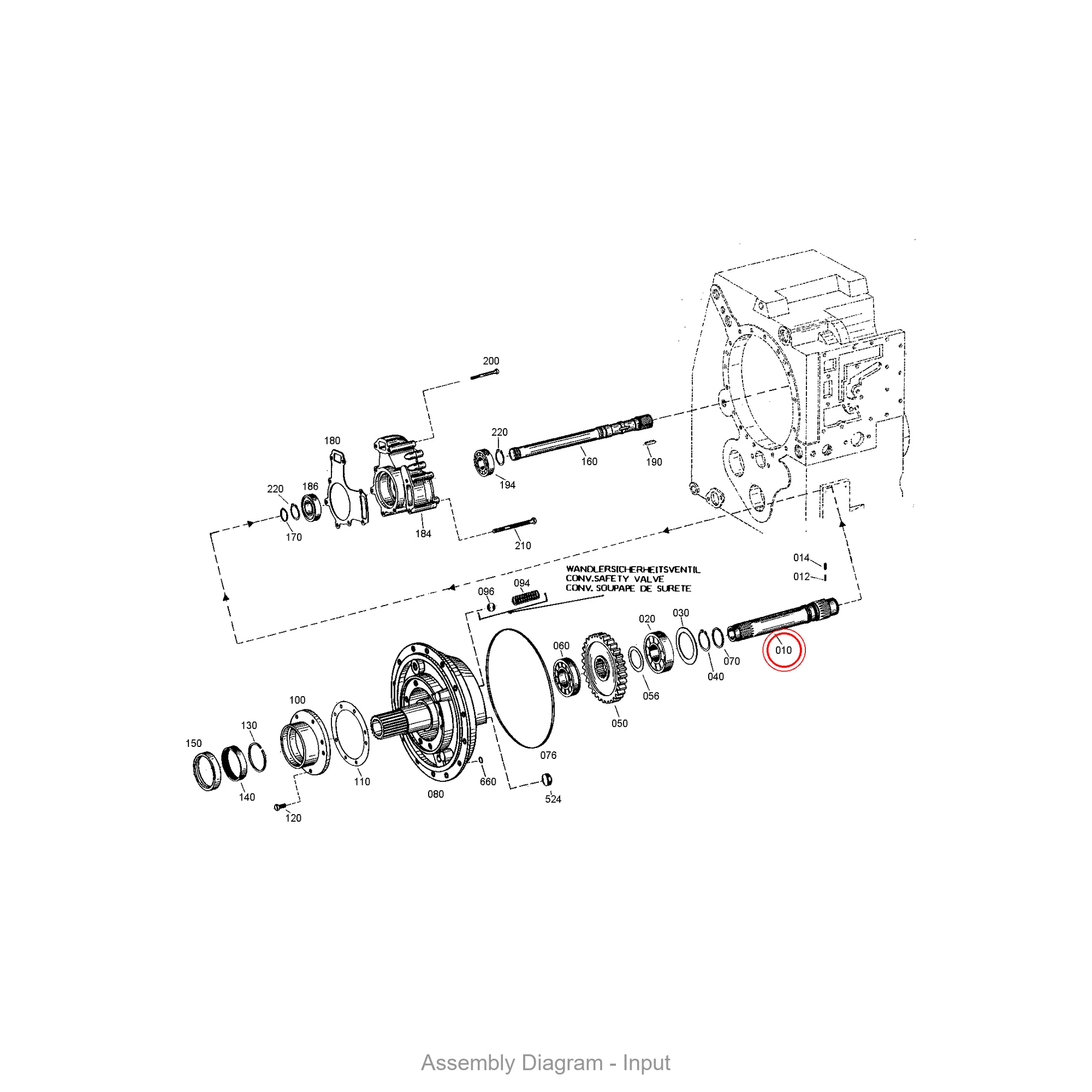 This input shaft is located in the input area of the transmission. It appears in 11 different assembly configurations. In the service manual, look for position number 010 in the Input section.