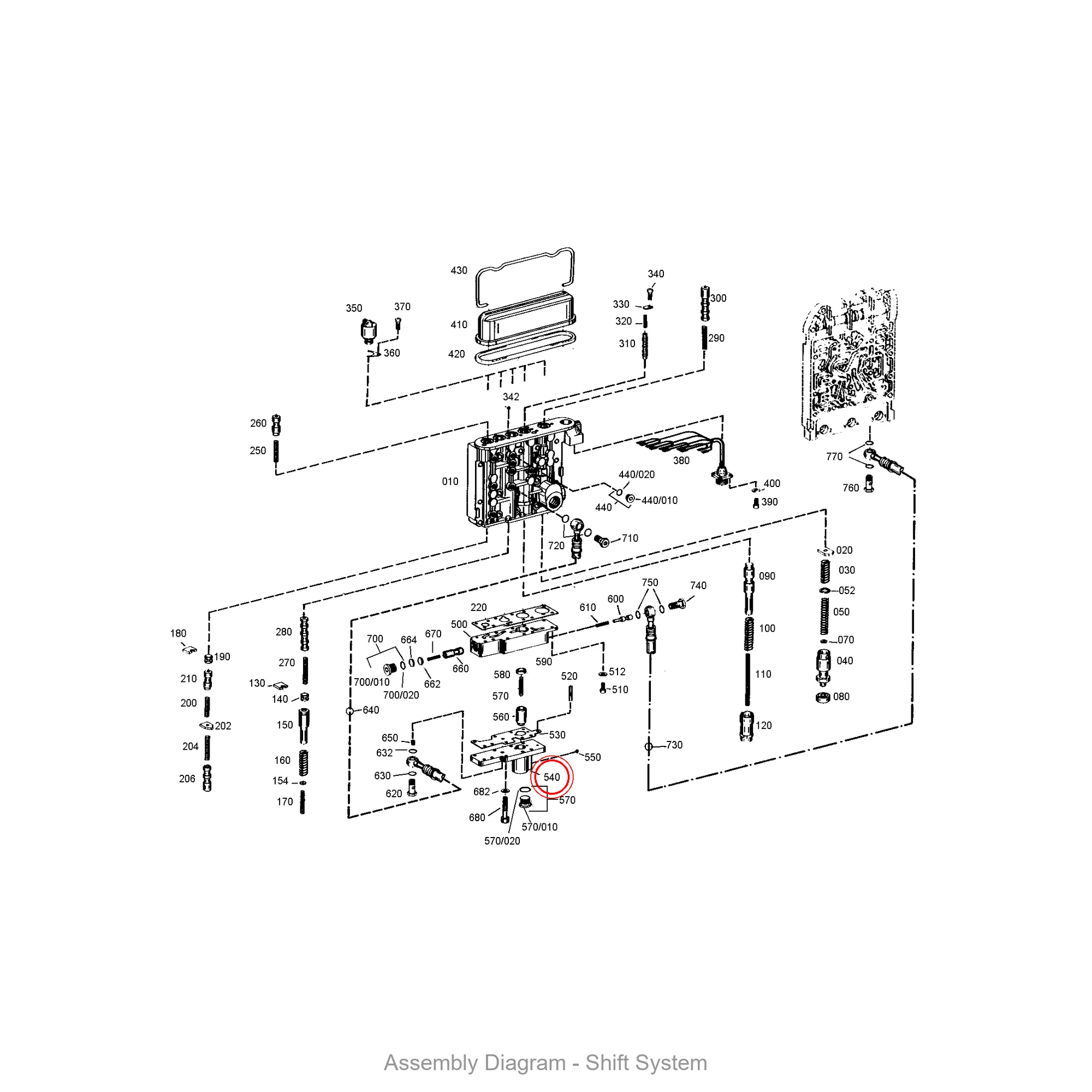 This cover is located in the shift system area of the transmission. It appears in 12 different assembly configurations. In the service manual, look for position number 540 in the Shift System section.