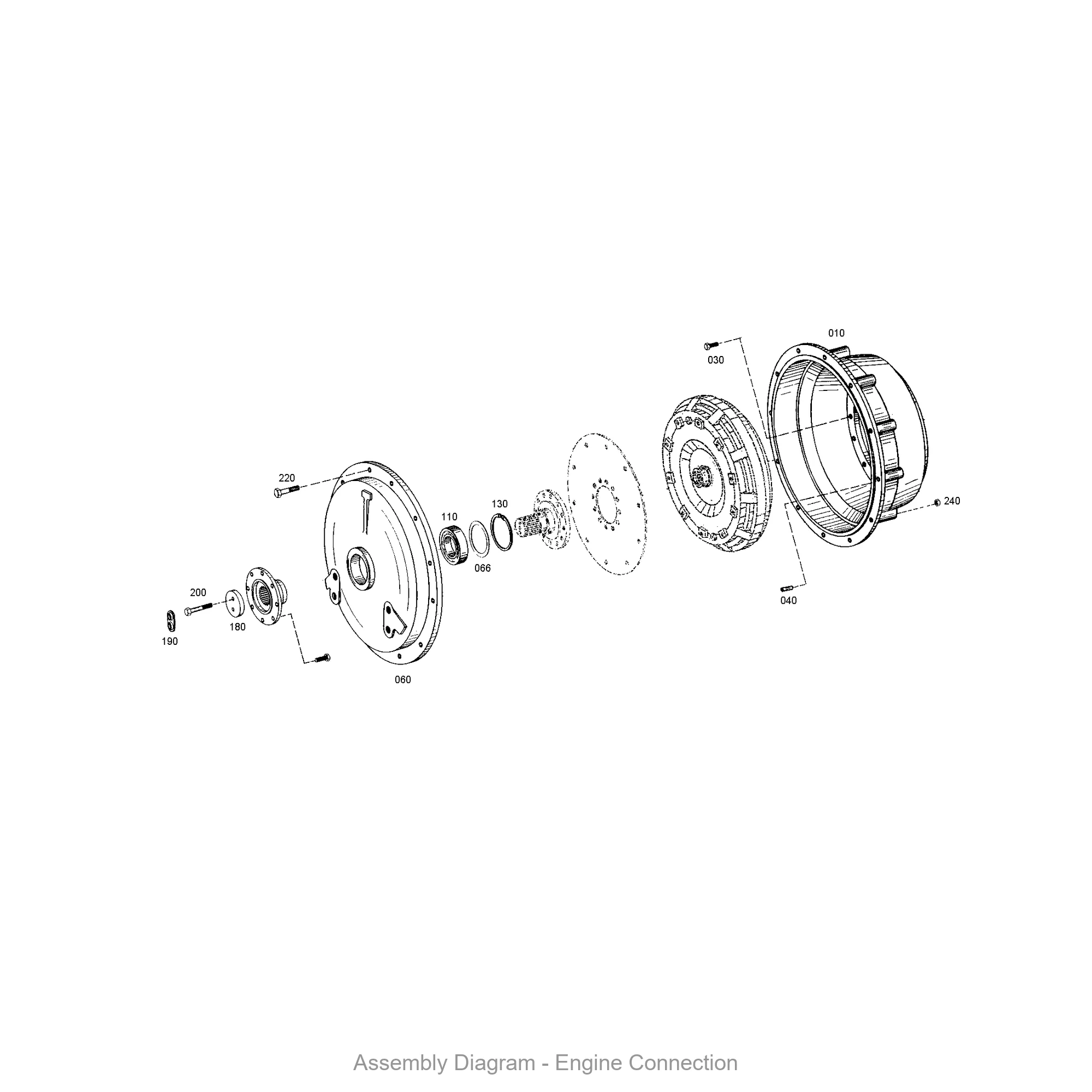 This connecting housing is located in the engine connection area of the transmission. It appears in 1 different assembly configurations. In the service manual, look for position number 010 in the Engine Connection section.