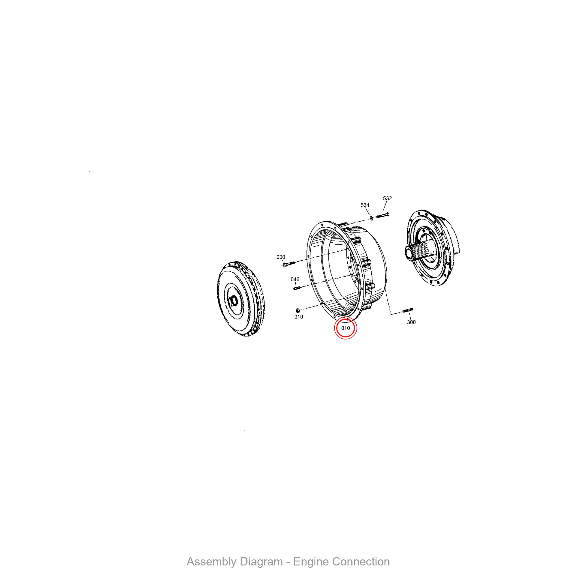 This connecting housing is located in the engine connection area of the transmission. It appears in 5 different assembly configurations. In the service manual, look for position number 010 in the Engine Connection section.