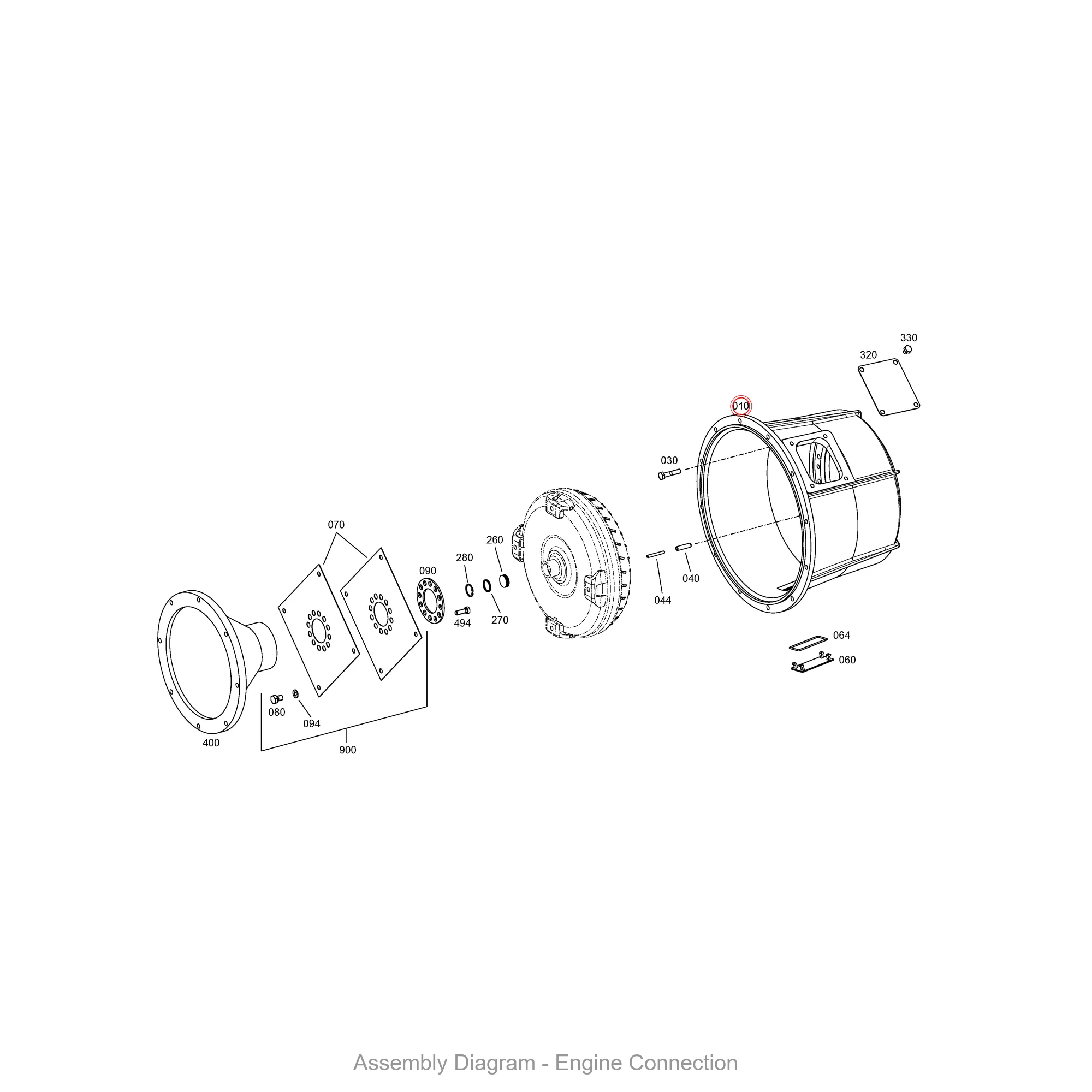 This connecting housing is located in the engine connection area of the transmission. It appears in 30 different assembly configurations. In the service manual, look for position number 010 in the Engine Connection section.