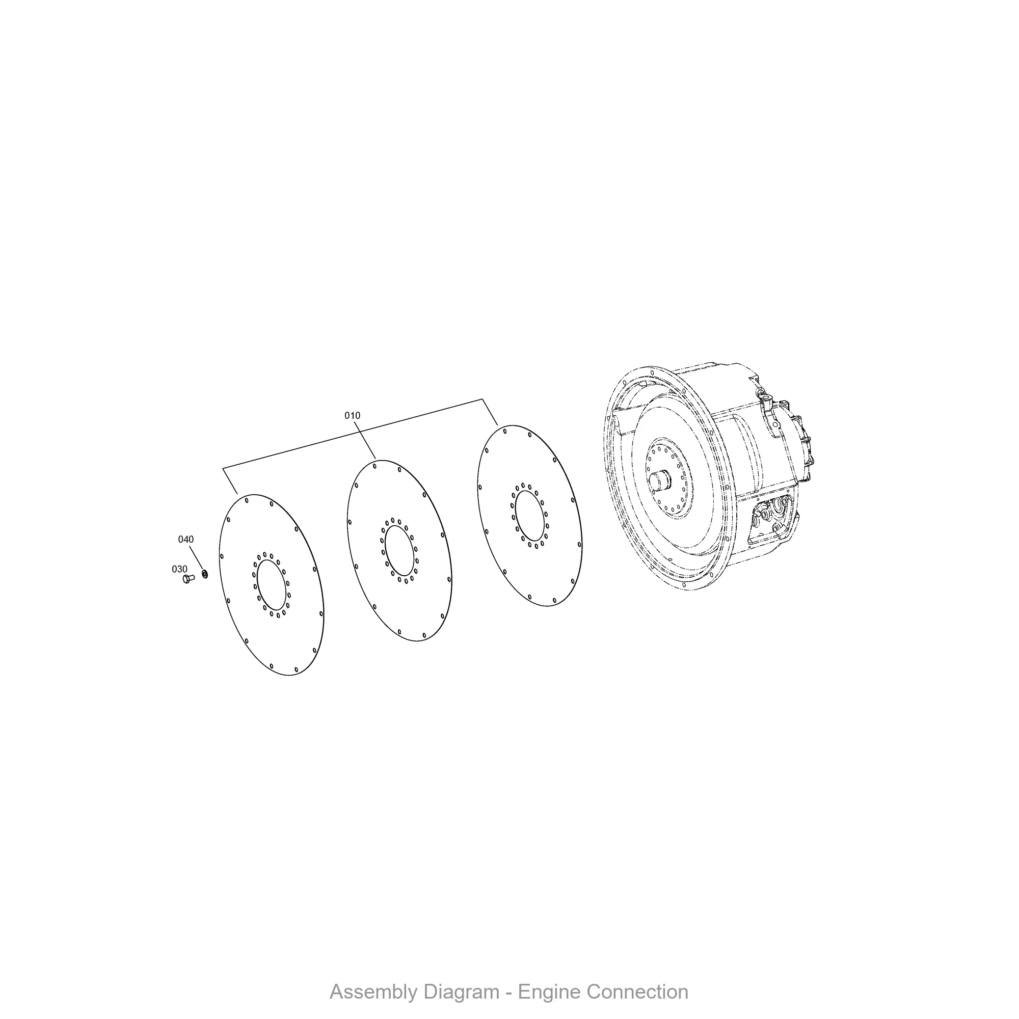 This engine connection is found in 12 ZF transmission variants, including: 3 WG 260, 4 WG 250(2), 4 WG 258, 4 WG 260, 4 WG 260(1), 4 WG 260(2), 4 WG 260(4), 4 WG 261, 4 WG 308, 5 WG 261. These transmissions are commonly used in wheel loaders, graders, and other heavy construction equipment. Contact us to verify fitment for your specific machine.