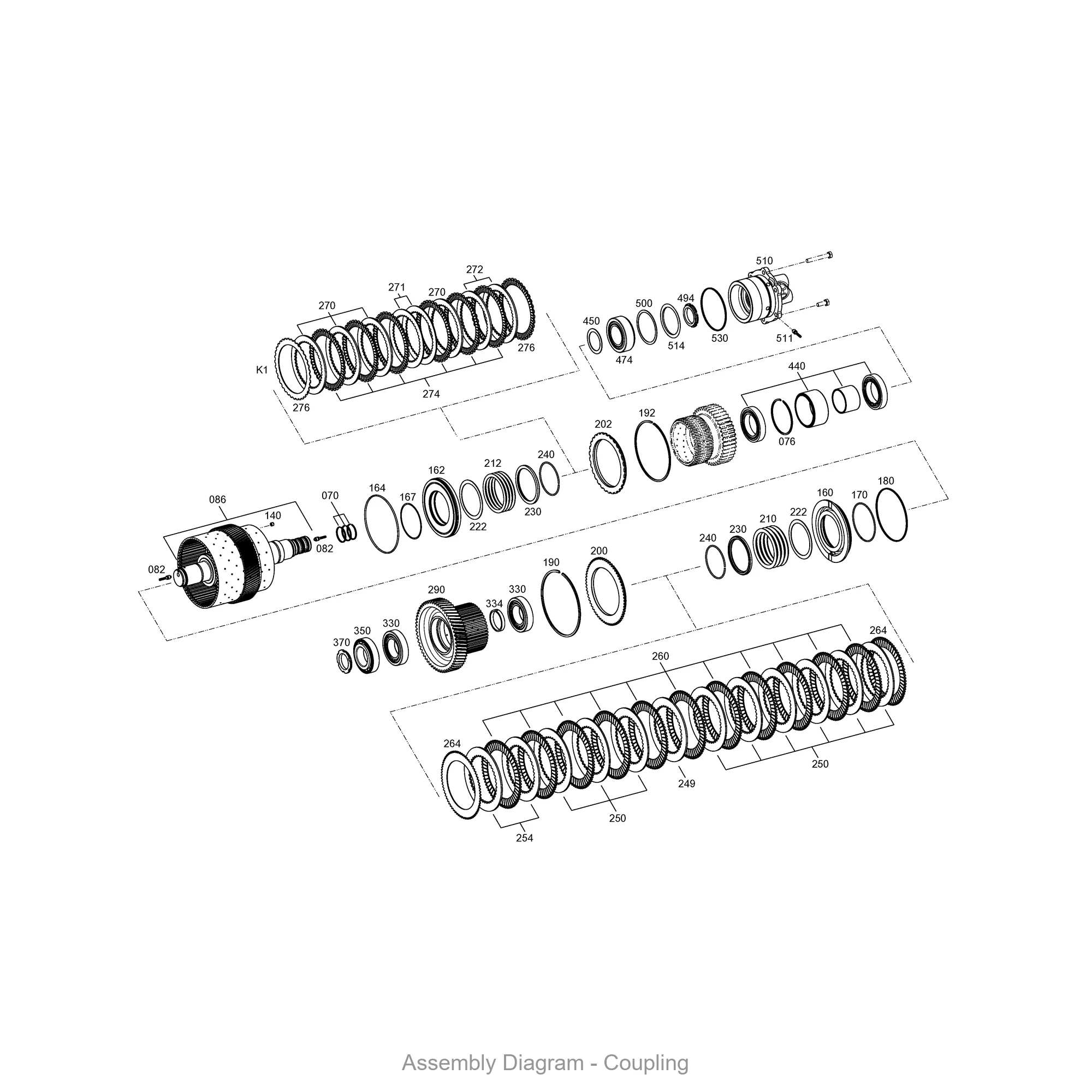This coupling is found in 5 ZF transmission variants, including: 3 WG 260, 3 WG 261, 4 WG 261, 4 WG 261(4), 5 WG 261. These transmissions are commonly used in wheel loaders, graders, and other heavy construction equipment. Contact us to verify fitment for your specific machine.
