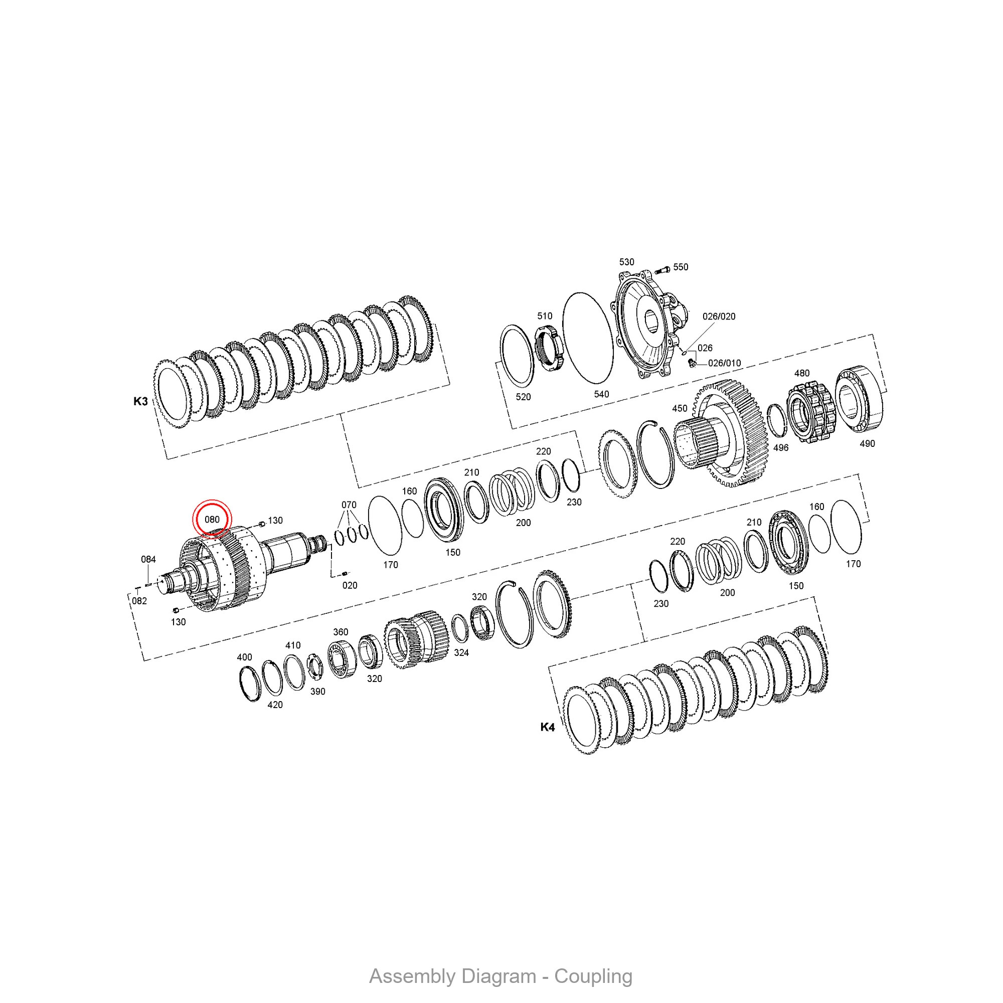 This disc carrier is located in the coupling area of the transmission. It appears in 15 different assembly configurations. In the service manual, look for position number 080 in the Coupling section.