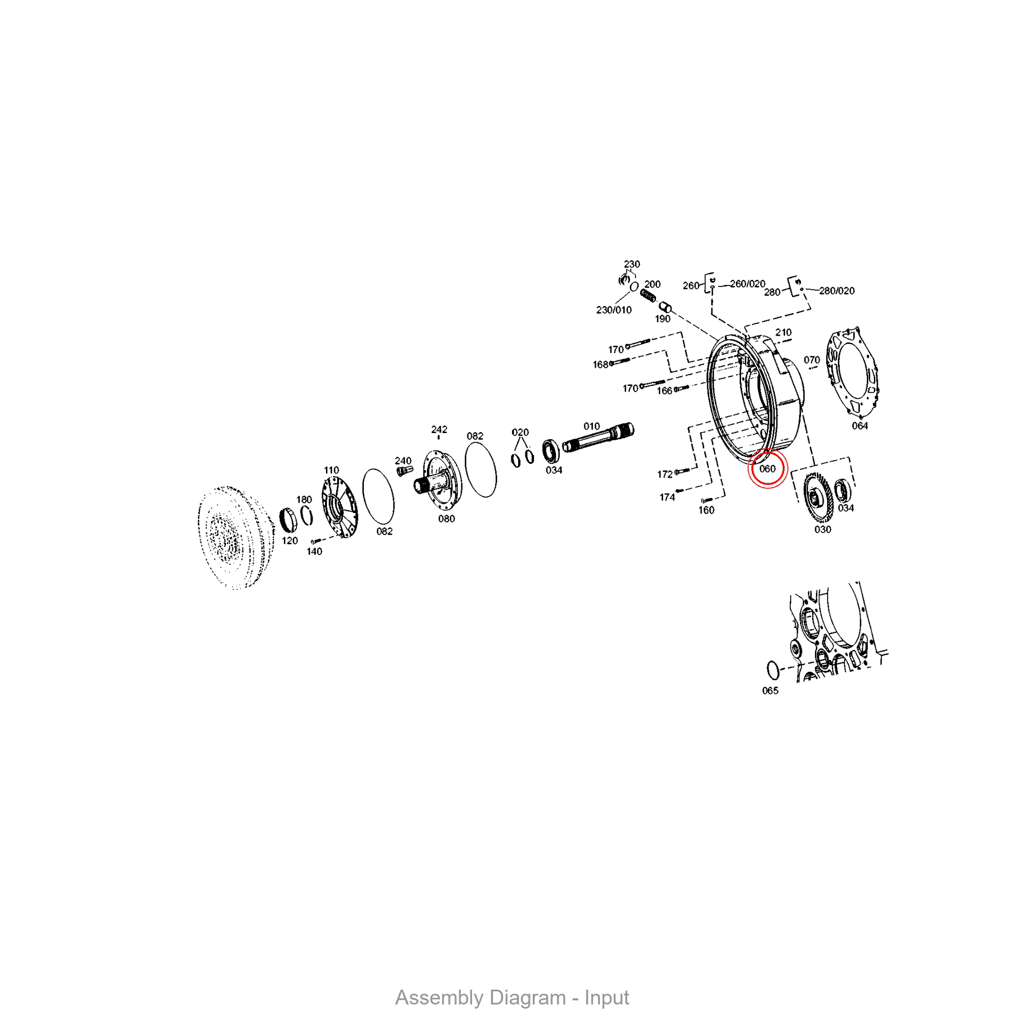 This converter bell is located in the input area of the transmission. It appears in 28 different assembly configurations. In the service manual, look for position number 060 in the Input section.