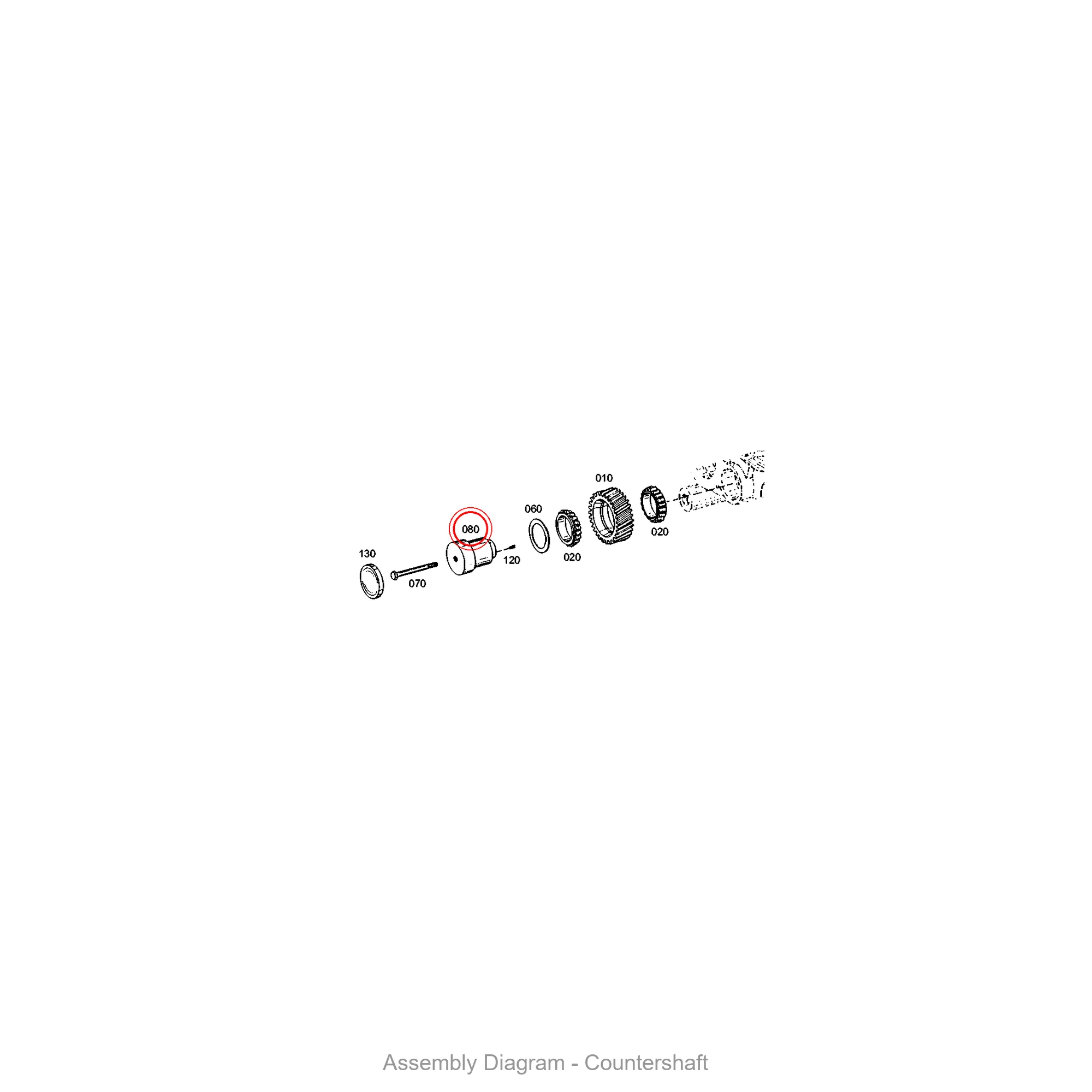 This axle is located in the countershaft area of the transmission. It appears in 15 different assembly configurations. In the service manual, look for position number 080 in the Countershaft section.
