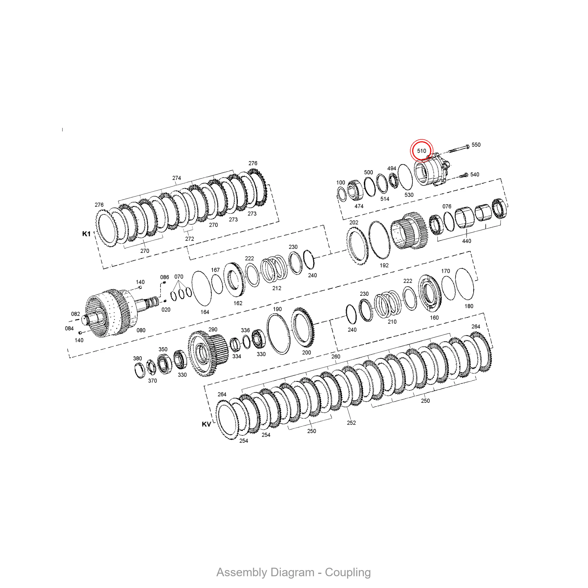 This bearing cover is located in the coupling area of the transmission. It appears in 30 different assembly configurations. In the service manual, look for position number 510 in the Coupling section.