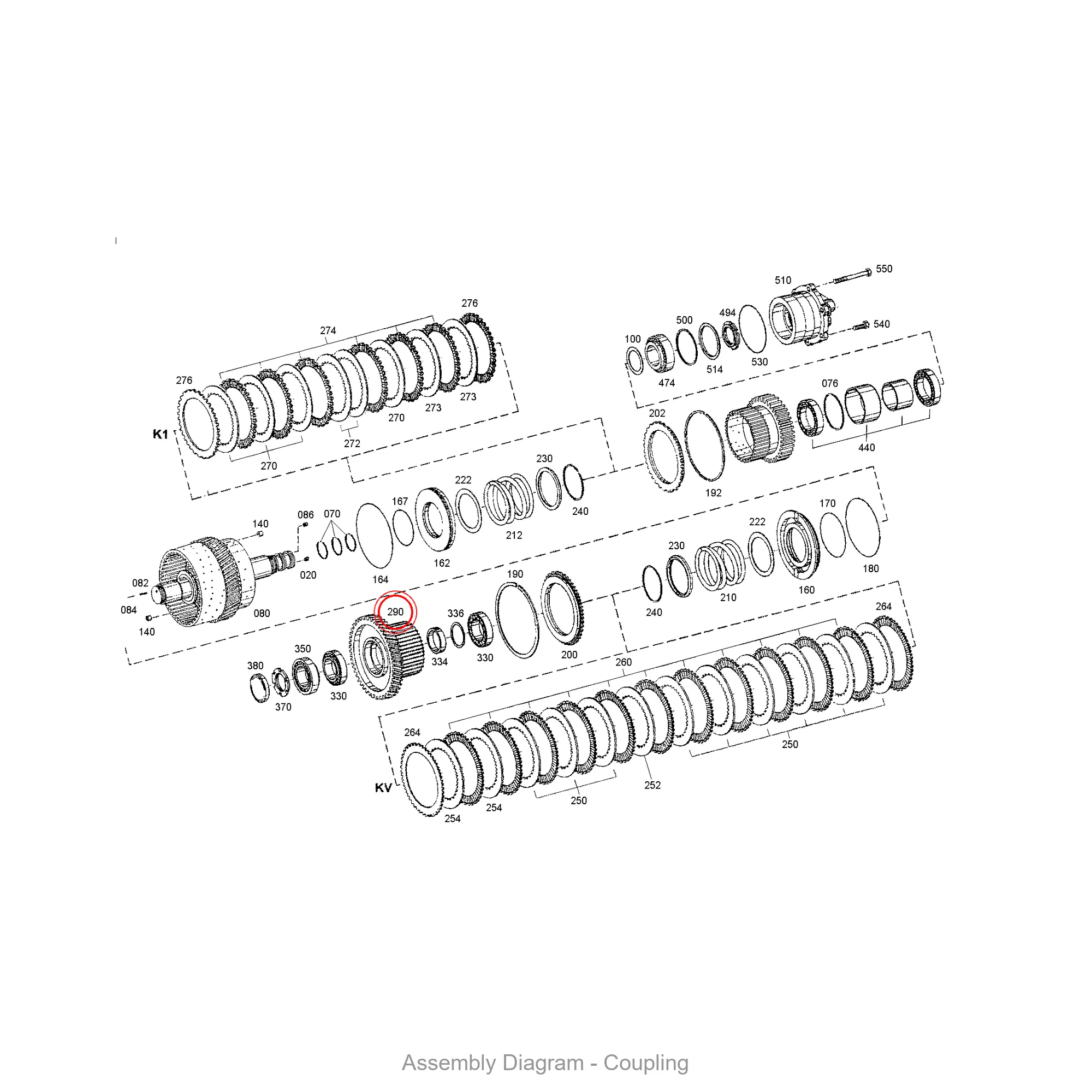 This spur gear is located in the coupling area of the transmission. It appears in 9 different assembly configurations. In the service manual, look for position number 290 in the Coupling section.