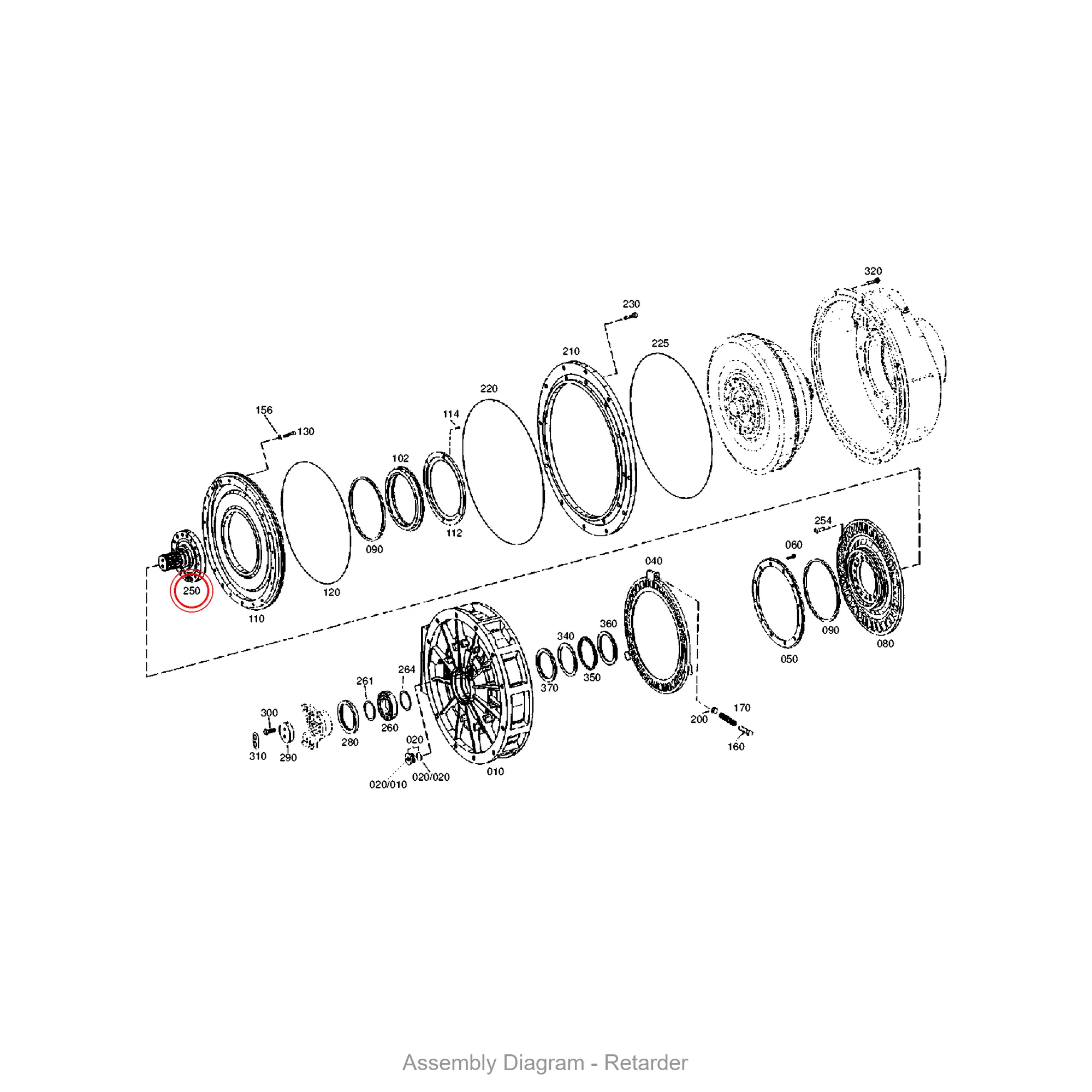 This flange shaft is located in the input, retarder area of the transmission. It appears in 30 different assembly configurations. In the service manual, look for position number 010 in the Input section.