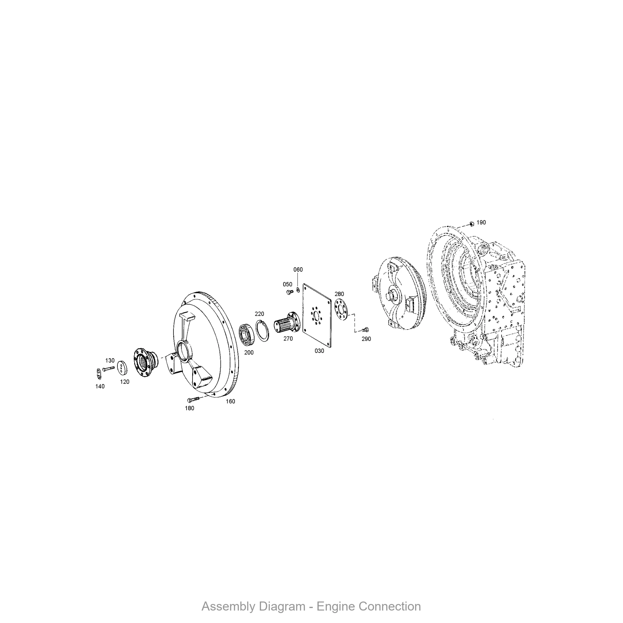 This engine connection is found in 6 ZF transmission variants, including: 3 WG 100(500), 4 WG 100(500), 4 WG 110, 4 WG 110(500), 6 WG 110, 6 WG 110(500). These transmissions are commonly used in wheel loaders, graders, and other heavy construction equipment. Contact us to verify fitment for your specific machine.