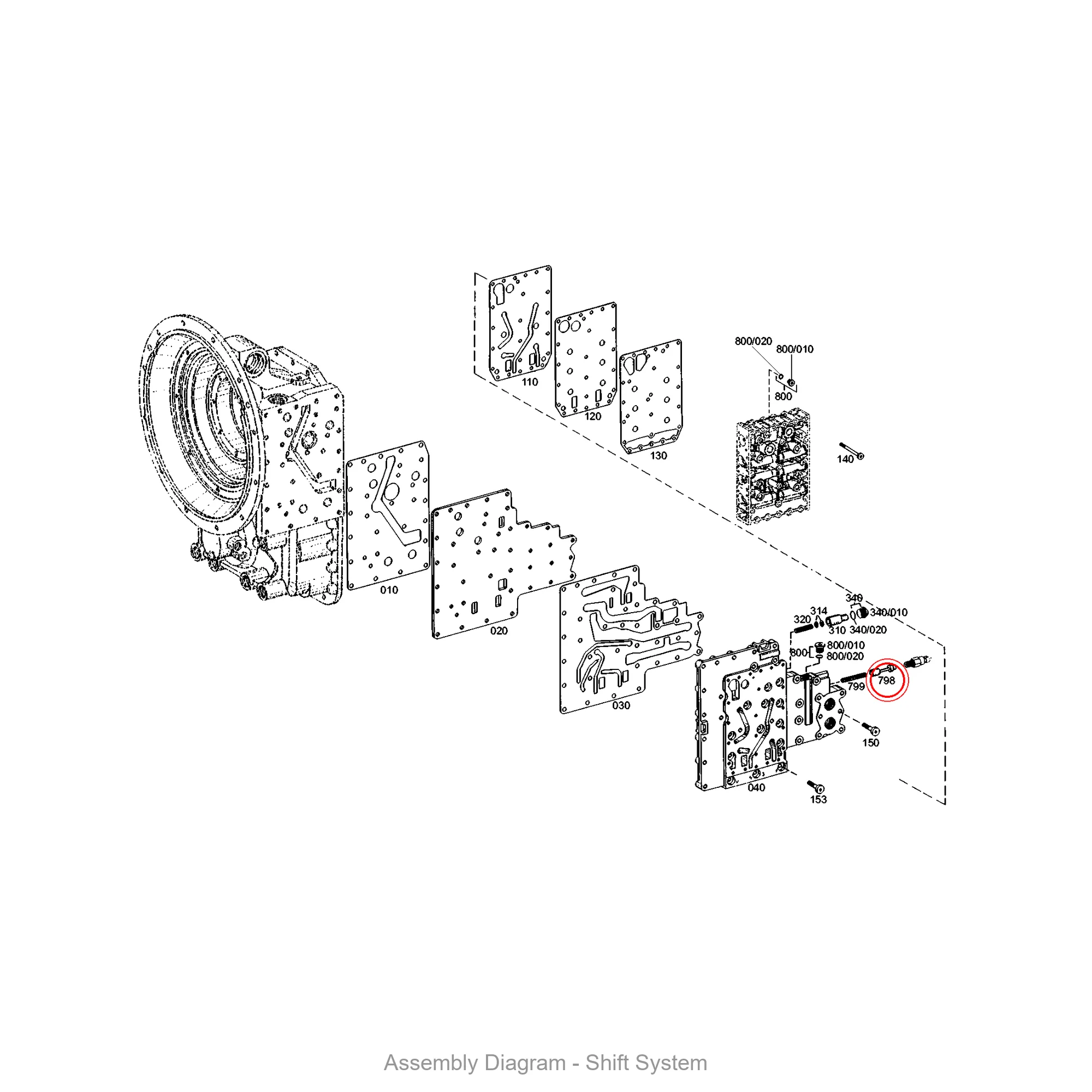 This piston is located in the shift system area of the transmission. It appears in 25 different assembly configurations. In the service manual, look for position number 798 in the Shift System section.