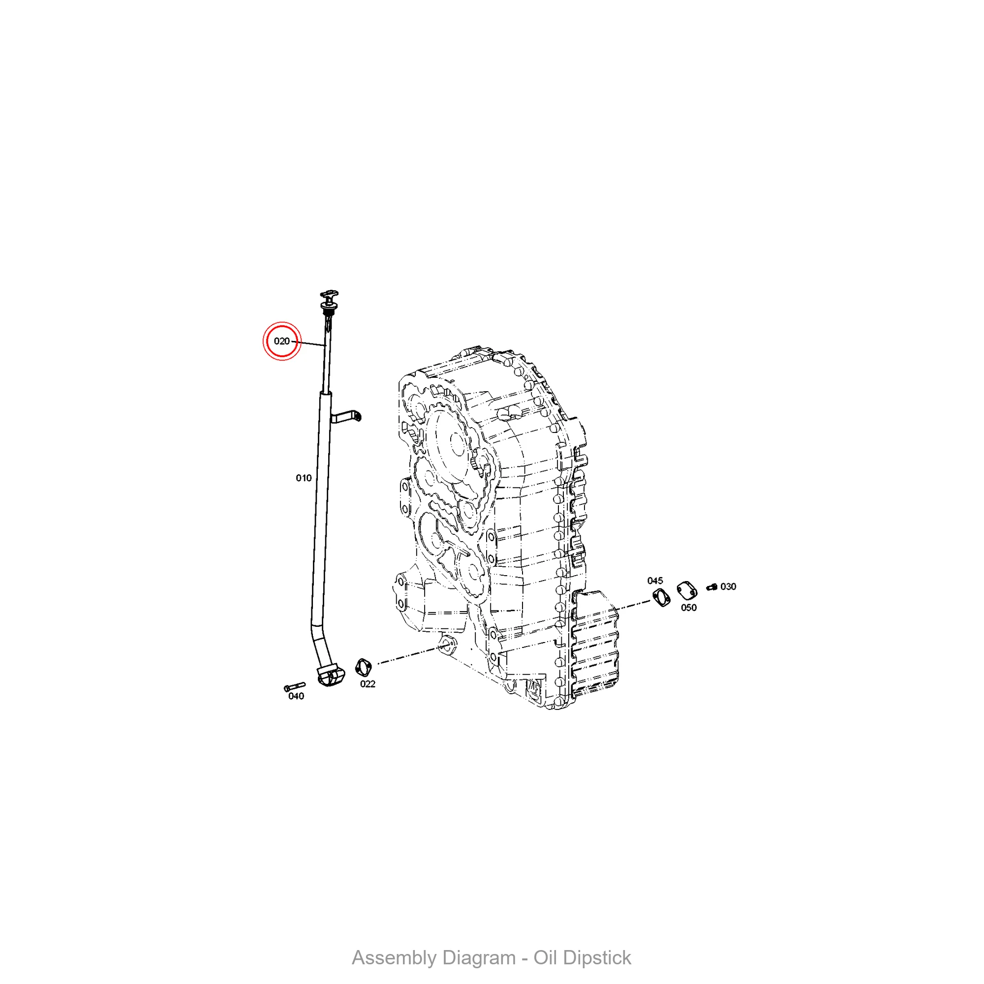 This oil dipstick is located in the oil dipstick area of the transmission. It appears in 30 different assembly configurations. In the service manual, look for position number 020 in the Oil Dipstick section.