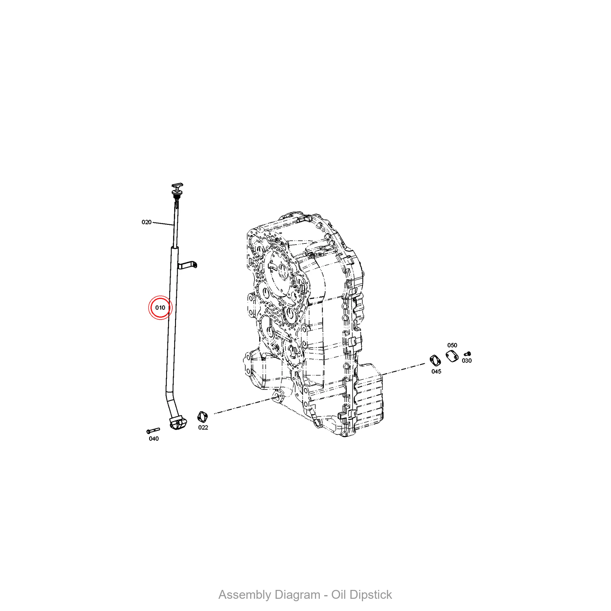 This oil level tube is located in the oil dipstick area of the transmission. It appears in 30 different assembly configurations. In the service manual, look for position number 010 in the Oil Dipstick section.