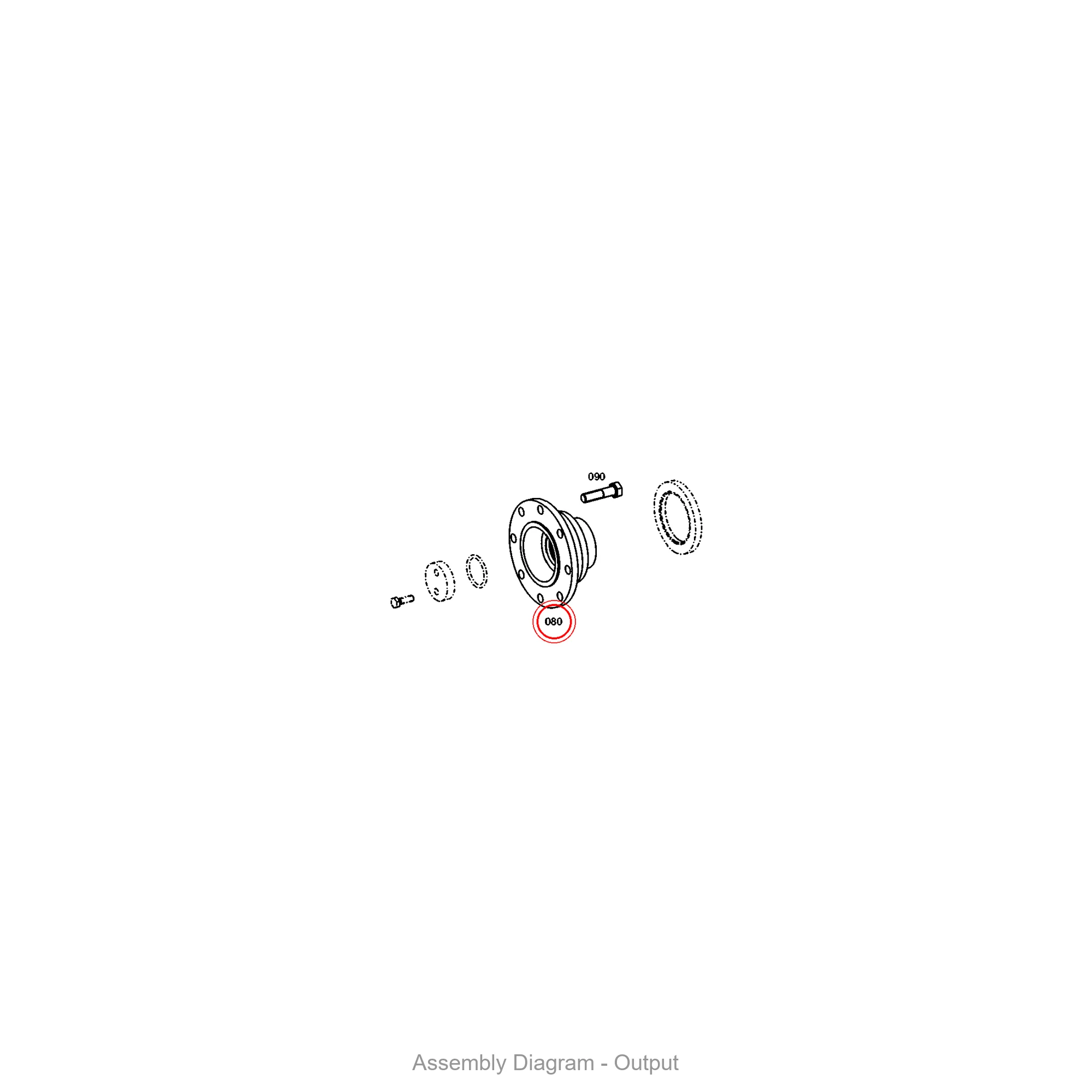 This output flange is located in the output area of the transmission. It appears in 28 different assembly configurations. In the service manual, look for position number 080 in the Output section.