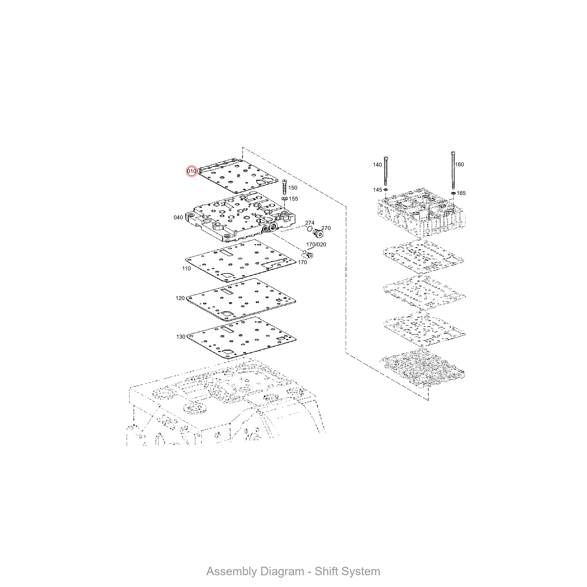 This gasket is located in the shift system area of the transmission. It appears in 1 different assembly configurations. In the service manual, look for position number 010 in the Shift System section.