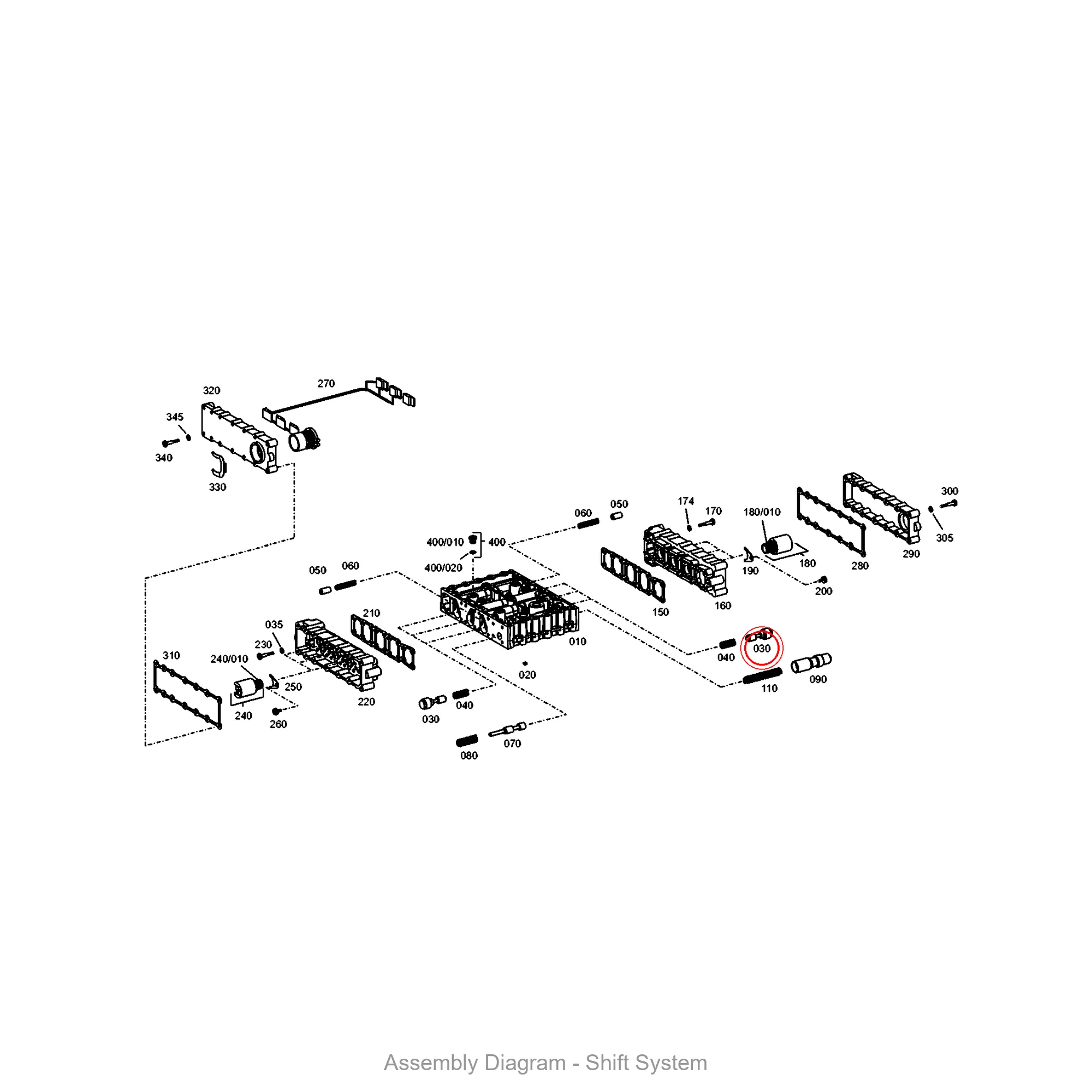 This piston is located in the shift system area of the transmission. It appears in 1 different assembly configurations. In the service manual, look for position number 030 in the Shift System section.