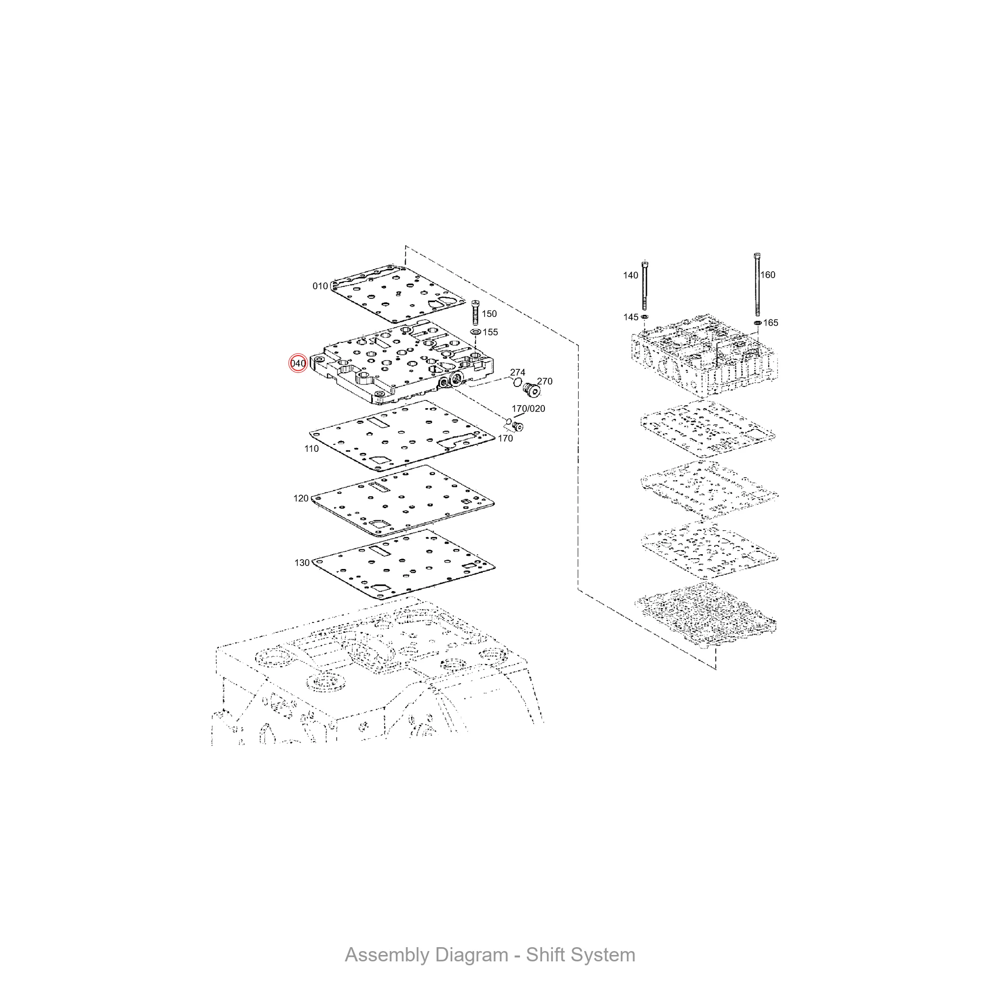 This plate is located in the shift system area of the transmission. It appears in 1 different assembly configurations. In the service manual, look for position number 040 in the Shift System section.