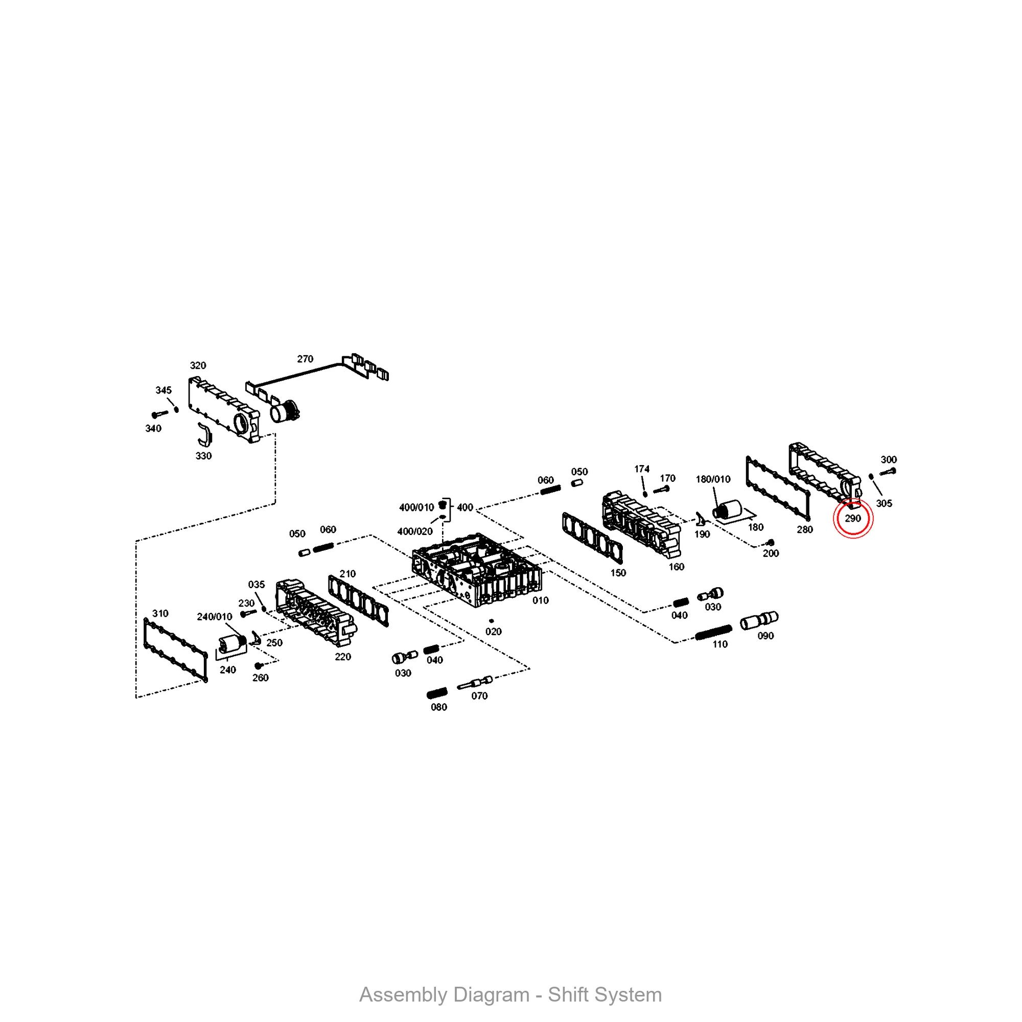 This cover is located in the shift system area of the transmission. It appears in 1 different assembly configurations. In the service manual, look for position number 290 in the Shift System section.