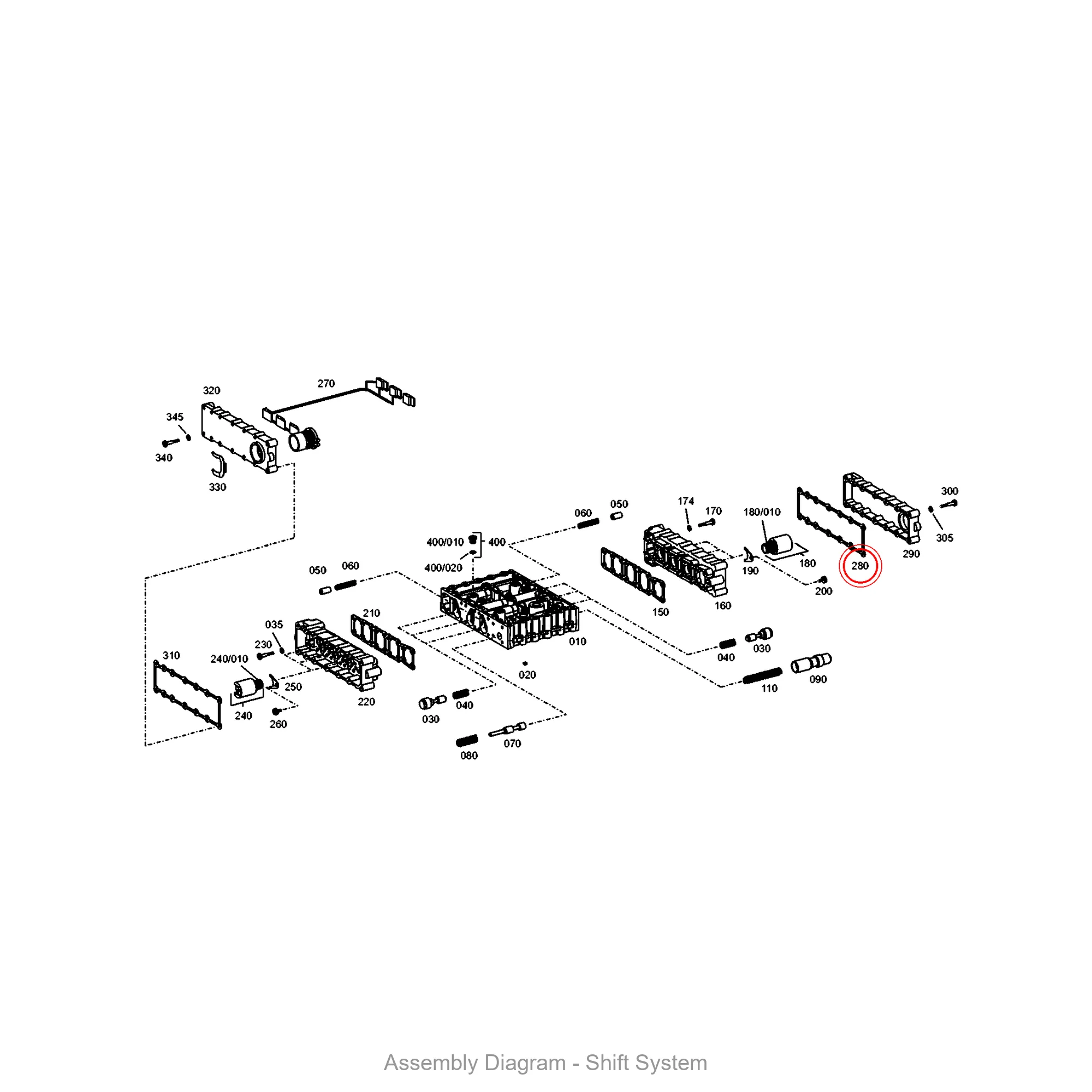 This gasket is located in the shift system area of the transmission. It appears in 1 different assembly configurations. In the service manual, look for position number 280 in the Shift System section.
