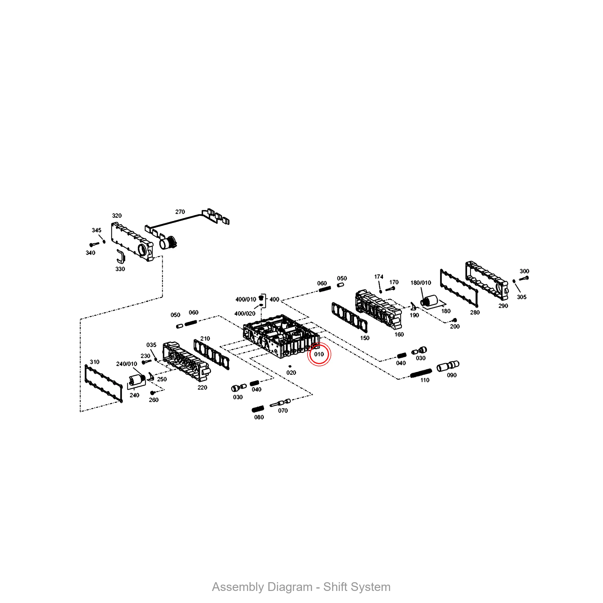This valve block is located in the shift system area of the transmission. It appears in 1 different assembly configurations. In the service manual, look for position number 010 in the Shift System section.