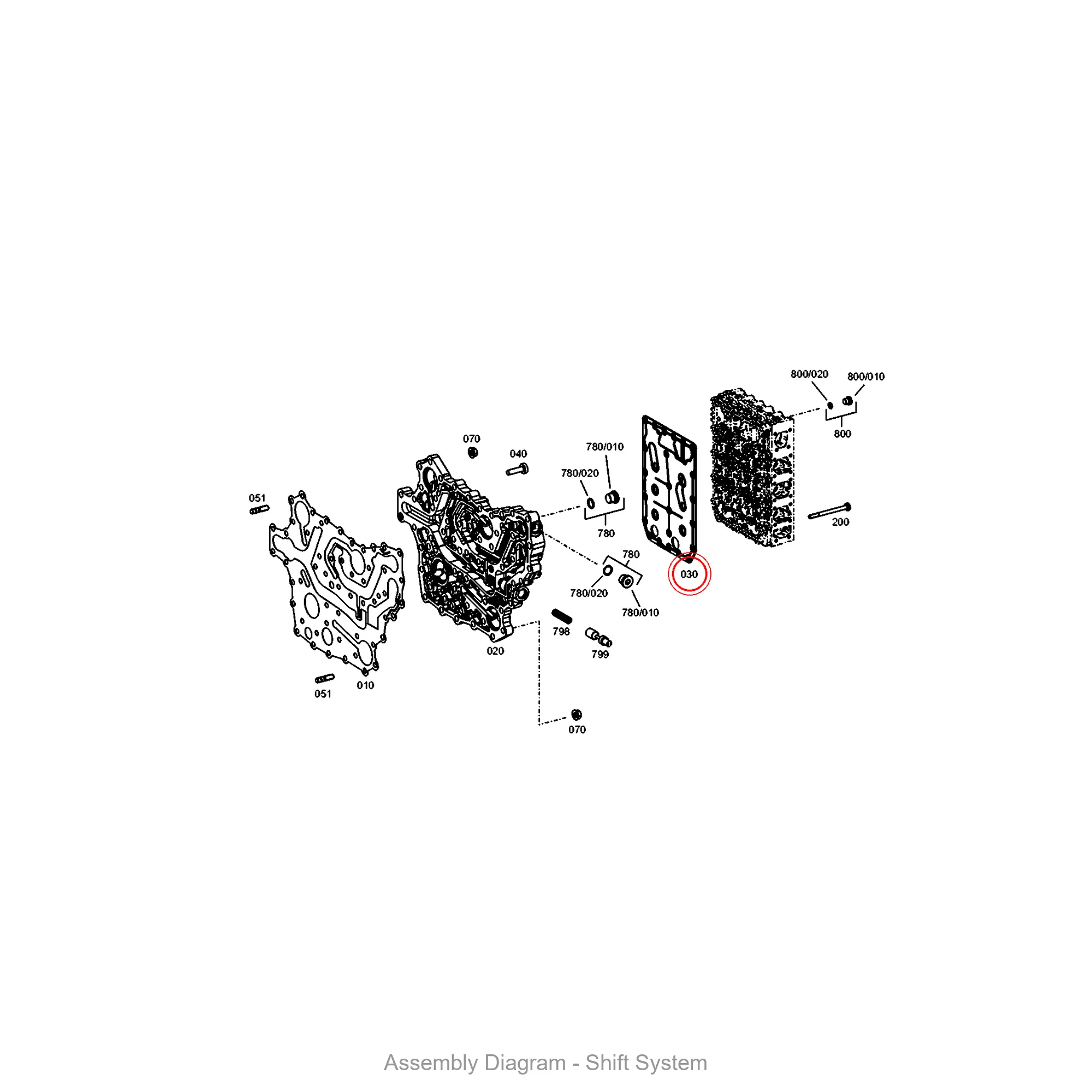 This intermediate sheet is located in the shift system area of the transmission. It appears in 30 different assembly configurations. In the service manual, look for position number 030 in the Shift System section.