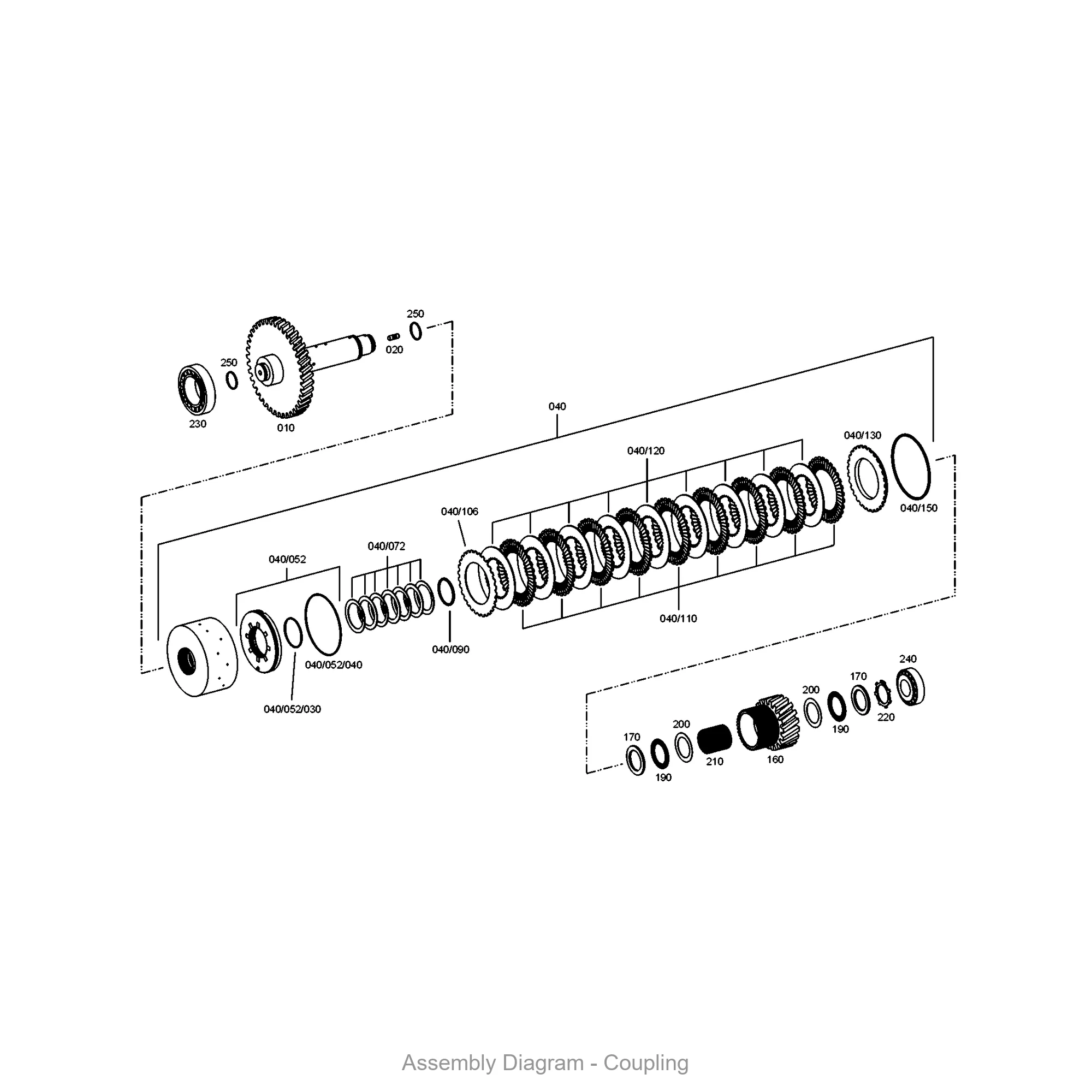 This coupling is located in the coupling, wg 190, wg 210 area of the transmission. It appears in 30 different assembly configurations. In the service manual, look for position number 350 in the Bp 210 section.
