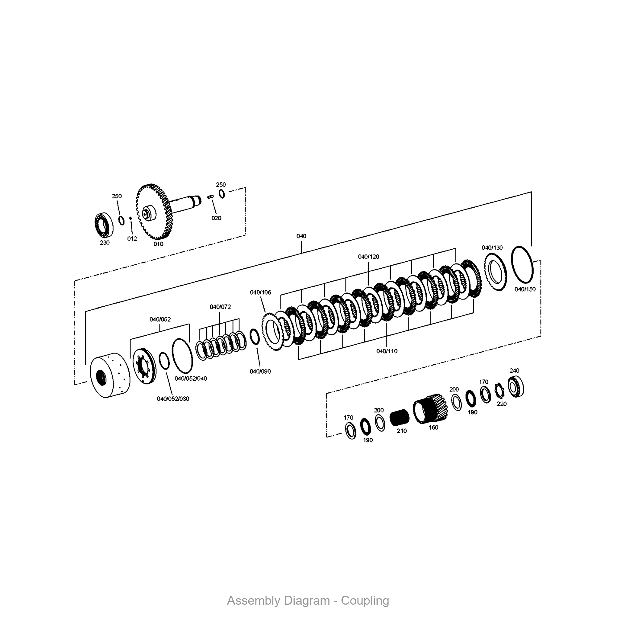 This coupling is located in the coupling, wg 190 area of the transmission. It appears in 30 different assembly configurations. In the service manual, look for position number 350 in the Loose Parts section.