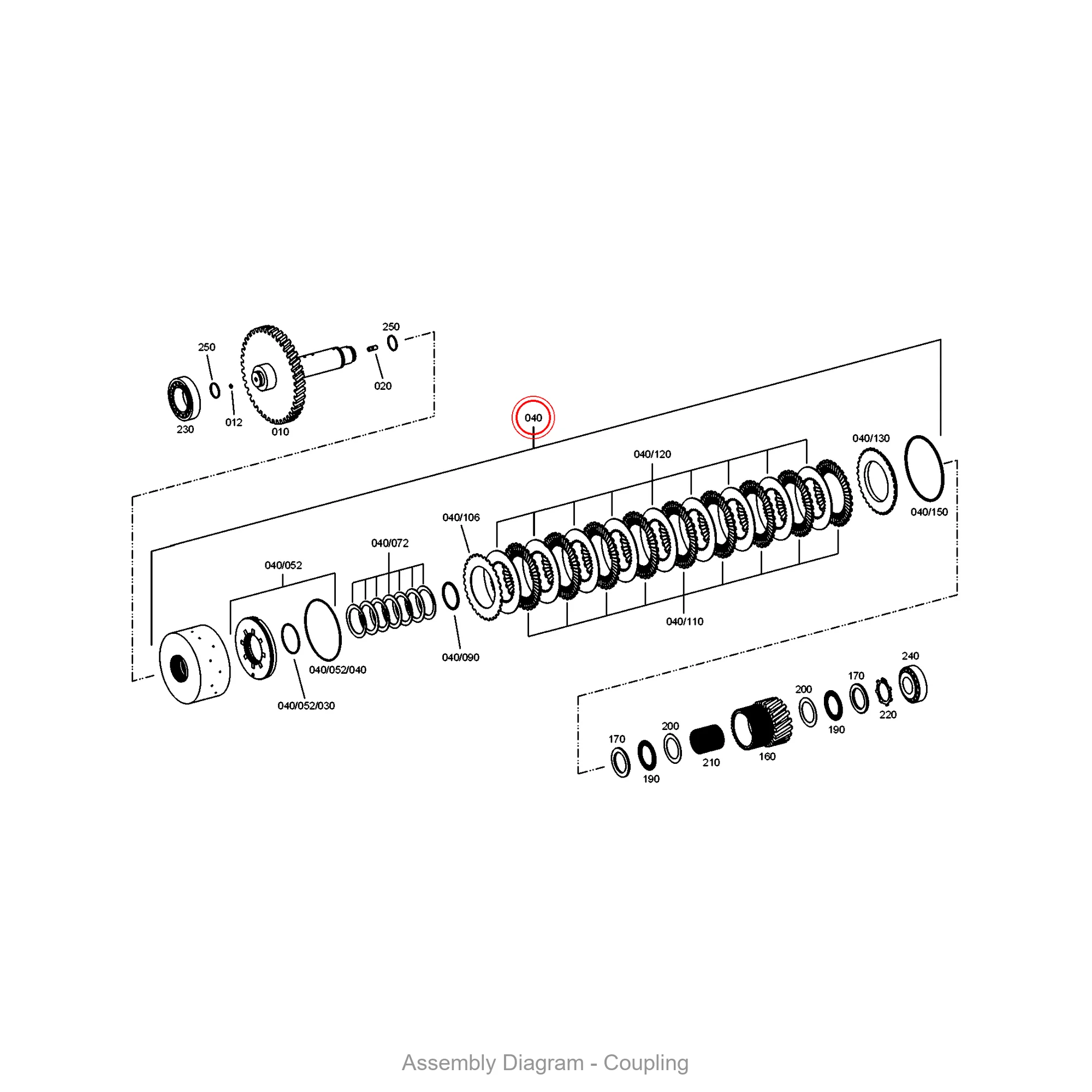 This coupling is located in the clutch, coupling area of the transmission. It appears in 30 different assembly configurations. In the service manual, look for position number 040 in the Clutch section.