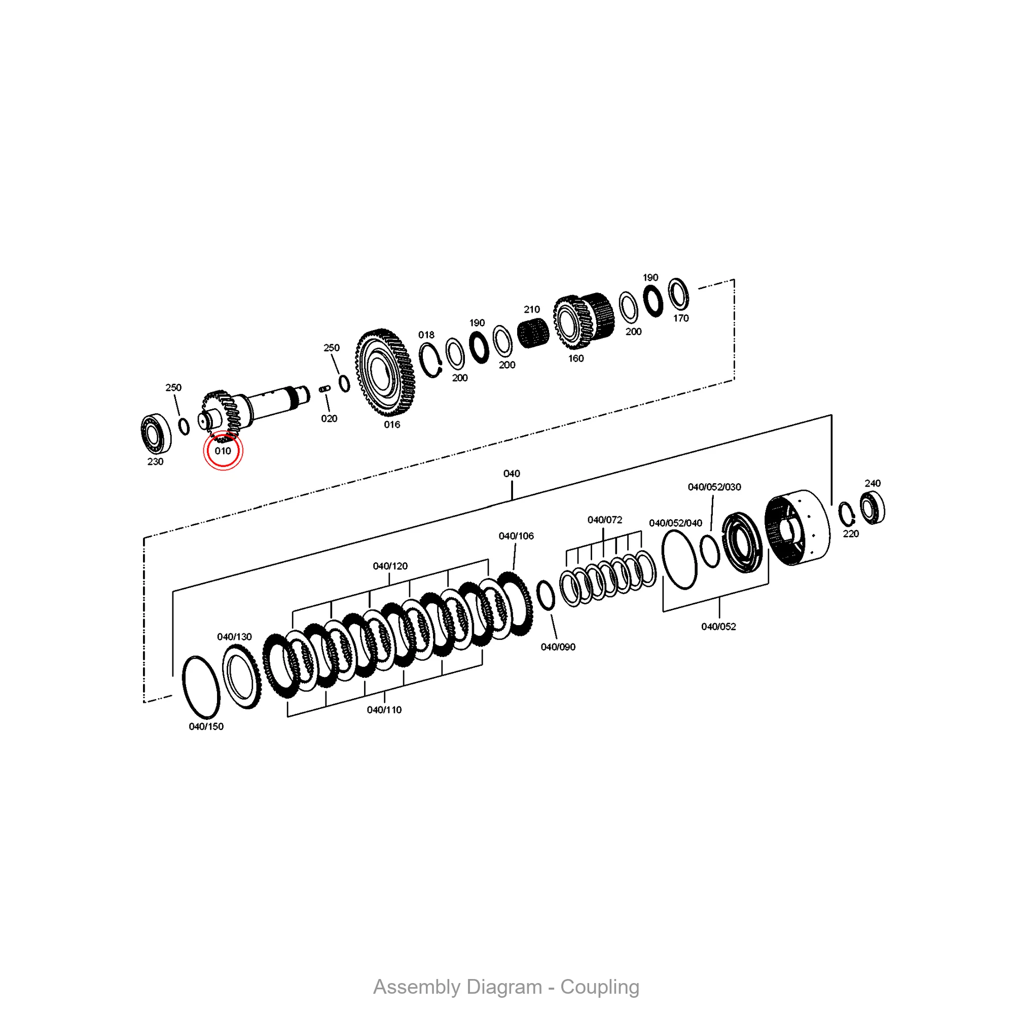 This shaft is located in the coupling area of the transmission. It appears in 30 different assembly configurations. In the service manual, look for position number 010 in the Clutch section.