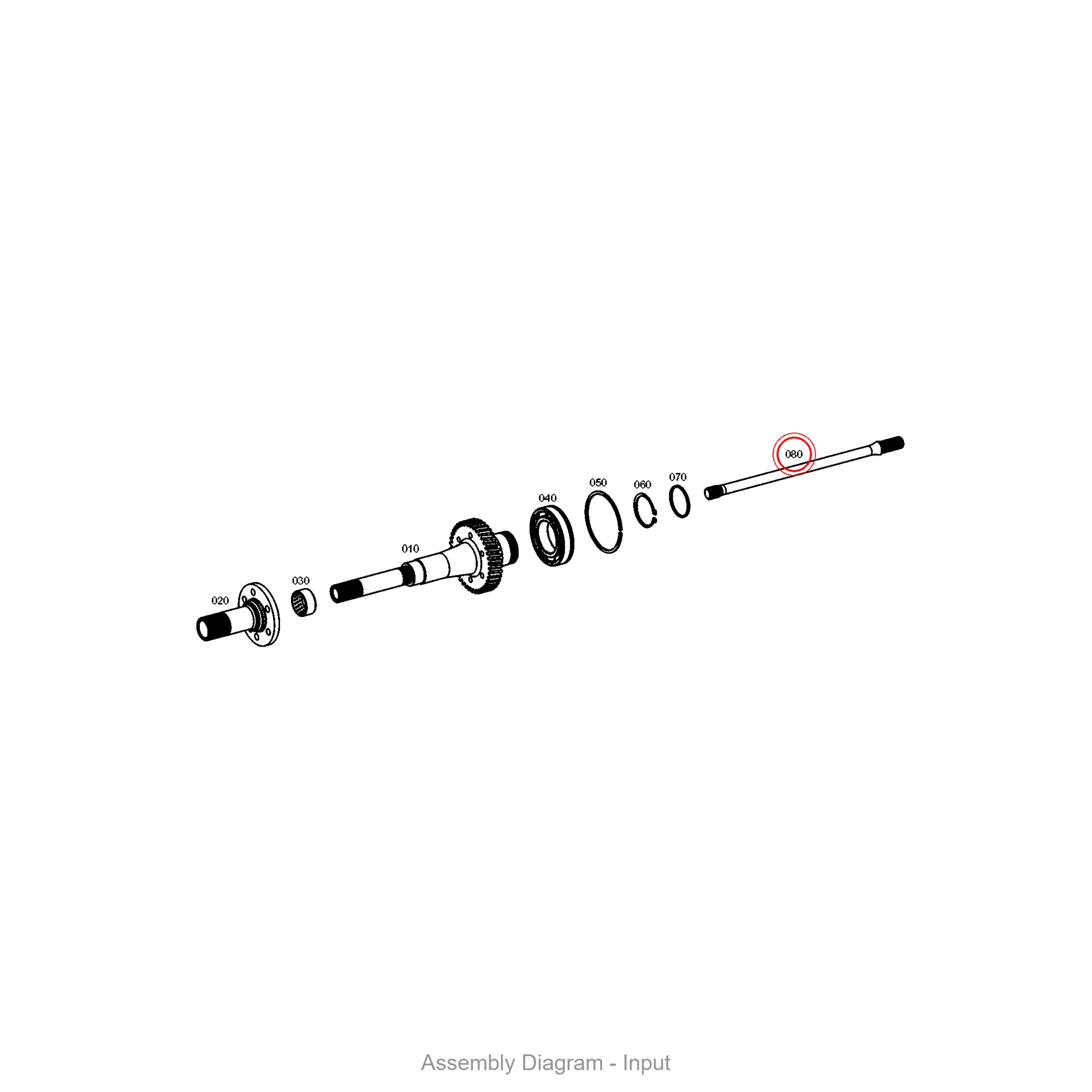 This central shaft is located in the input area of the transmission. It appears in 30 different assembly configurations. In the service manual, look for position number 080 in the Input section.