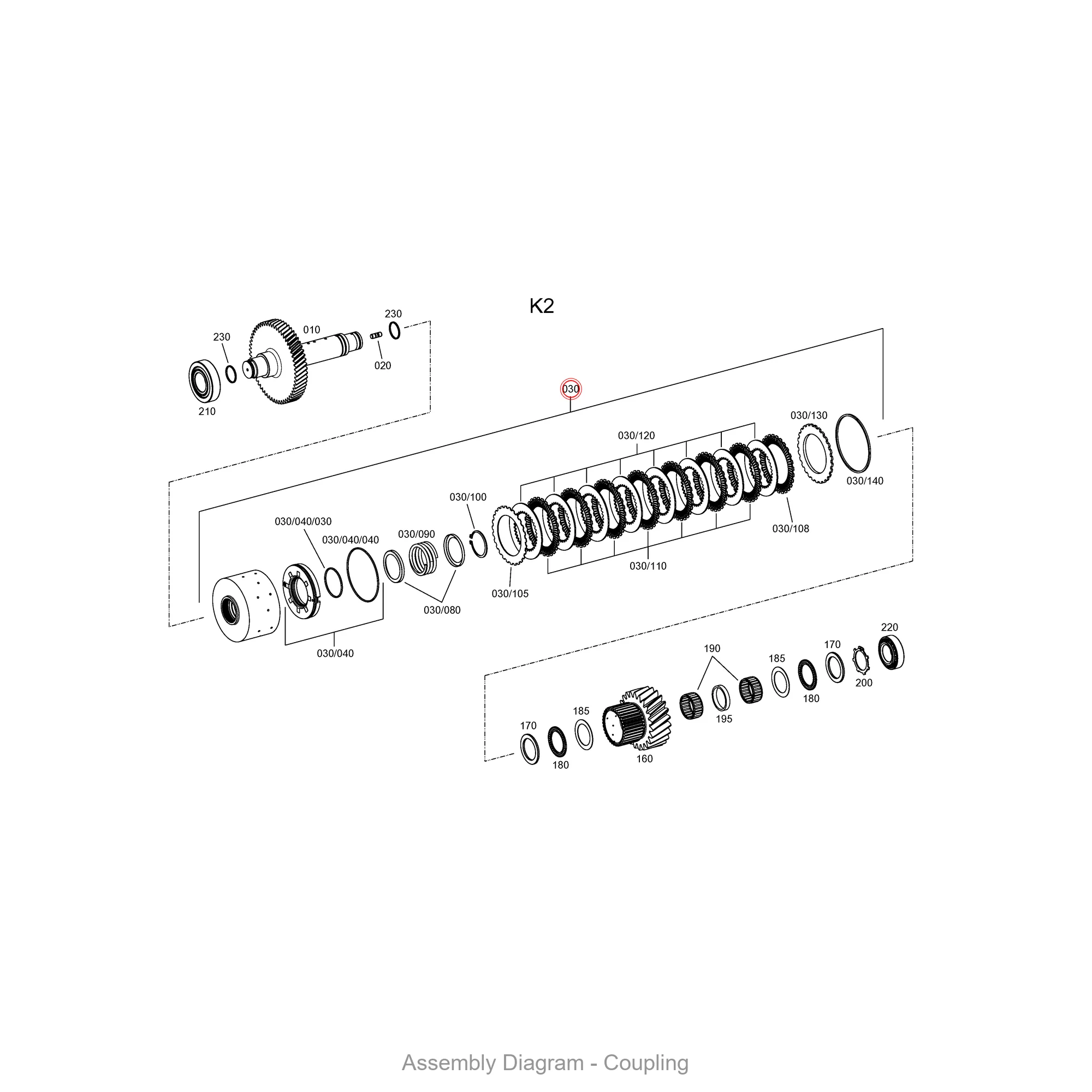This clutch is located in the coupling area of the transmission. It appears in 11 different assembly configurations. In the service manual, look for position number 030 in the Coupling section.