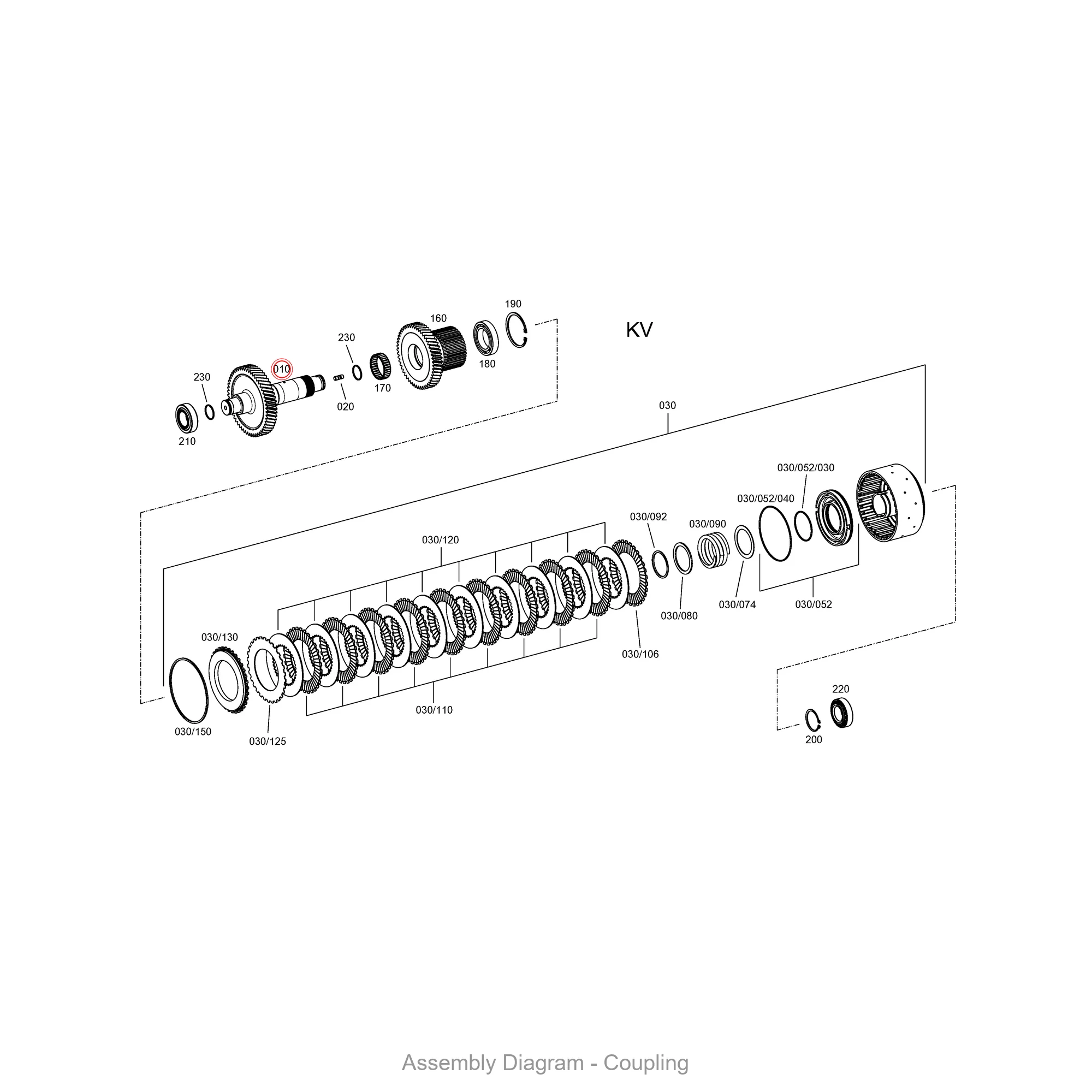 This shaft is located in the coupling area of the transmission. It appears in 21 different assembly configurations. In the service manual, look for position number 010 in the Coupling section.