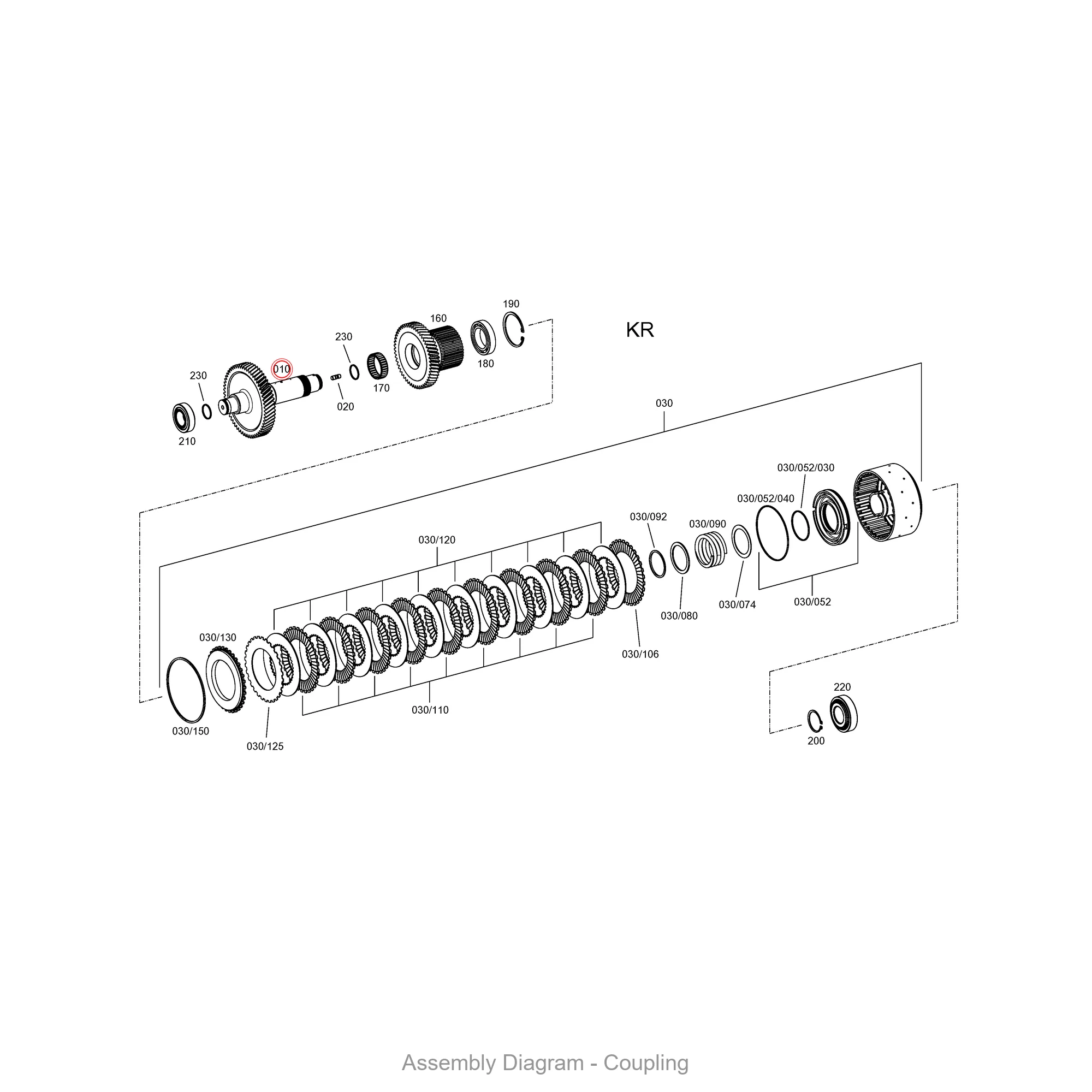 This shaft is located in the coupling area of the transmission. It appears in 21 different assembly configurations. In the service manual, look for position number 010 in the Coupling section.